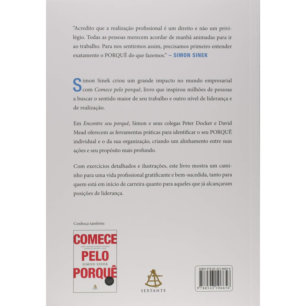 Simon Sinek criou um grande impacto no mundo empresarial com Comece pelo porquê, livro que inspirou milhões de pessoas a buscar o sentido maior de seu trabalho e outro nível de liderança e de realização. Em Encontre seu porquê, Simon e seus colegas Peter Docker e David Mead oferecem as ferramentas práticas para identificar o seu PORQUÊ individual e o da sua organização, criando um alinhamento entre suas ações e seu propósito mais profundo. Com exercícios detalhados e ilustrações, esse livro mostra um caminho para uma vida profissional gratificante e bem-sucedida, tanto para quem está em início de carreira quanto para aqueles que já alcançaram posições de liderança. "Acredito que a realização profissional é um direito e não um privilégio. Todas as pessoas merecem acordar de manhã animadas para ir ao trabalho. Para nos sentirmos assim, precisamos primeiro entender exatamente o PORQUÊ do que fazemos."– Simon Sinek