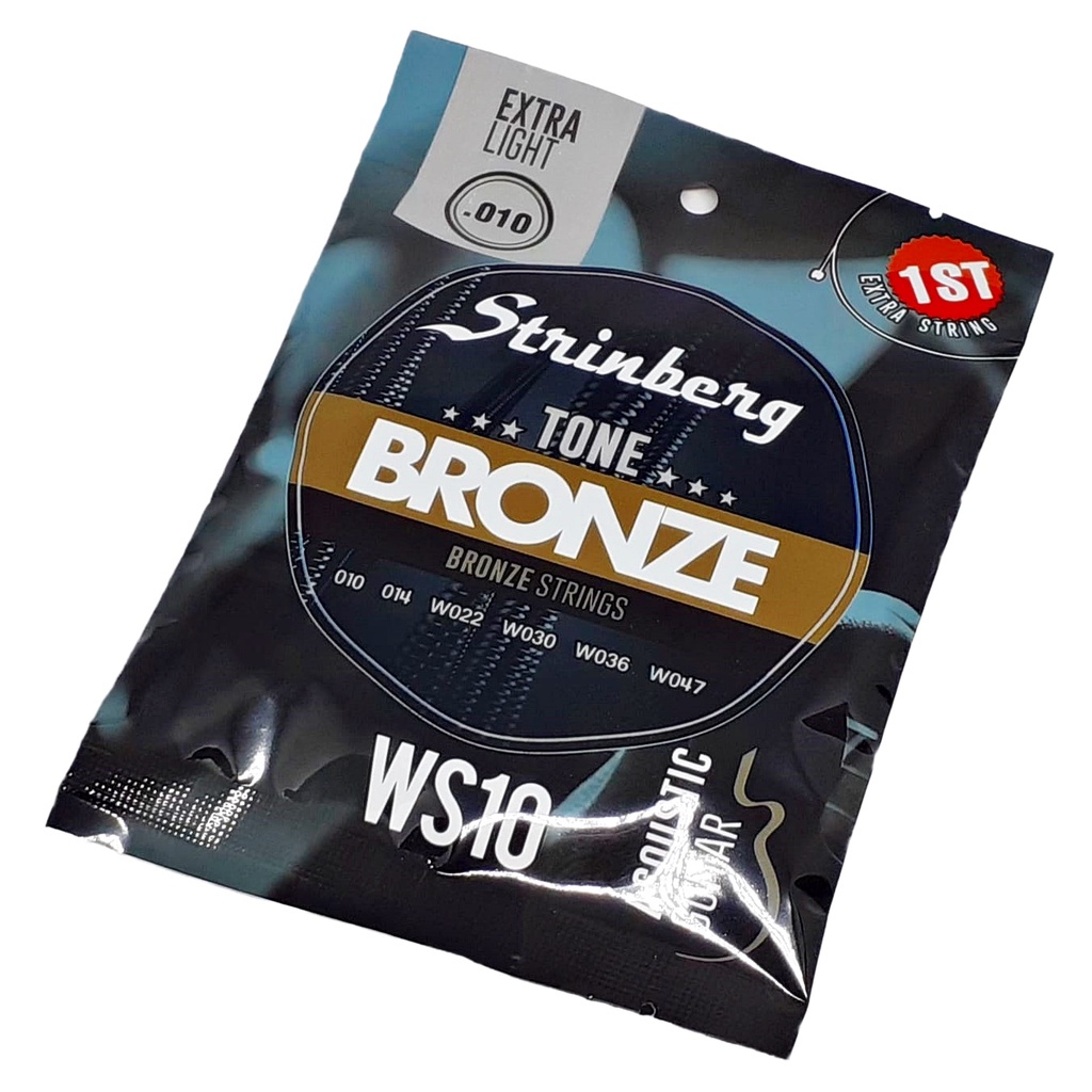 Jogo De Cordas Para Violão Aço (Folk) 010 047 Strinberg WS10 Extra Light - Bronze Strings As cordas Strinberg proporcionam o timbre e brilho que você procura para o seu violão, somado a um ótimo e extremamente acessível preço, tanto para os músicos inciantes no instrumento quanto para os músicos profissionais (são ótimas para vários estilos musicais dando pegada para o timbre do violão). A Strinberg foi fundada no ano de 1993 com a proposta de oferecer aos mercados americanos a brasileiros (entre outros) instrumentos musicais e acessórios de ótima qualidade com um preço extremamente acessível. A linha de produtos da Strinberg possui um estilo próprio que se encaixa perfeitamente nos padrões de qualidade do mercado americano e ainda sim consegue ter impressa em seus produtos a essência da musicalidade brasileira. A Strinberg é muito conhecida por seus instrumentos de cordas, como guitarras, contrabaixos, violões e baixolões e vem ganhando mais e mais destaque a cada ano o Brasil. Da mesma forma que seus instrumentos musicais, seus encordoamentos para guitarra, baixo, violão e baixolão vem caindo no gosto dos músicos brasileiros cada vez mais, especialmente no gosto dos músicos inciantes e também dos músicos que levam a música como "hobbie". A linha para violão "Bronze Strings" apresenta um timbre bem legal, cheio e com um bom "suatain" para batidas e levadas com acordes. O encordoamento para Violão Aço Strinberg WS-10 Extra Light é o mais leve da linha, apresenta os calibres .010 / .047, você vai se surpreender com as cordas Strinberg no seu violão. Tensão das cordas: .010 / .014 / .022w / .030w / .036w / .047w (Extra Light) Conteúdo da embalagem: 6 Cordas + 1 Mi (1ª) Extra Fornecedor: Sonotec / Musimax (Distribuidor oficial dos produtos Strinberg no Brasil) OBS: O Guitar 5 é um revendedor autorizado das cordas Strinberg e todos os nossos produtos são originais e adquiridos de forma legal e com nota fiscal, portanto sua compra de cordas Strinberg está garantida com a gente! O MELHOR TIMBRE PARA O SEU INSTRUMENTO - CORDAS ORIGINAIS!