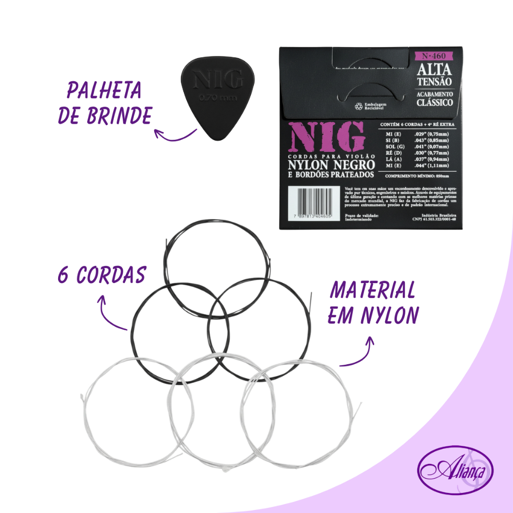Encordoamento Nig N-460 para Violão de Nylon - Máxima Qualidade e Performance! 🎸 Transforme seu violão de nylon com o encordoamento NI N-460! Ideal para músicos que buscam o equilíbrio perfeito entre som, conforto e durabilidade. As cordas NI N-460 são projetadas para oferecer uma performance excepcional, garantindo uma experiência sonora rica e clara. Características: Material de Alta Qualidade: Cordas de nylon com núcleo de fio de cobre, proporcionando um som mais ressonante e um toque suave. Som Rico e Balanceado: Ótima definição e projeção sonora para qualquer estilo de música. Conforto ao Tocar: Superfície suave para um desempenho confortável e sem esforço. Durabilidade e Resistência: Cordas com longa vida útil, resistindo ao desgaste e mantendo a afinação. Por que escolher o NI N-460? Qualidade Superior: As cordas NI N-460 são fabricadas com materiais premium para garantir uma experiência sonora de alto nível. Versatilidade: Perfeitas para diversos gêneros musicais, desde clássico até contemporâneo. Valor Imbatível: Excelente custo-benefício, com um preço acessível para músicos de todos os níveis. Compatibilidade: Ideal para violões de nylon, independente do nível de habilidade. Inclui: 1 conjunto de encordoamento NI N-460 para violão de nylon. Não perca a chance de melhorar o som do seu violão com o encordoamento NIG N-460! Adquira o seu agora e sinta a diferença na sua performance! Disponível para compra online com entrega rápida. Clique no link para garantir o seu! Alta tensão Acabamento clássico 4ª (RÉ) Extra Material - nylon negro e bordões prateados