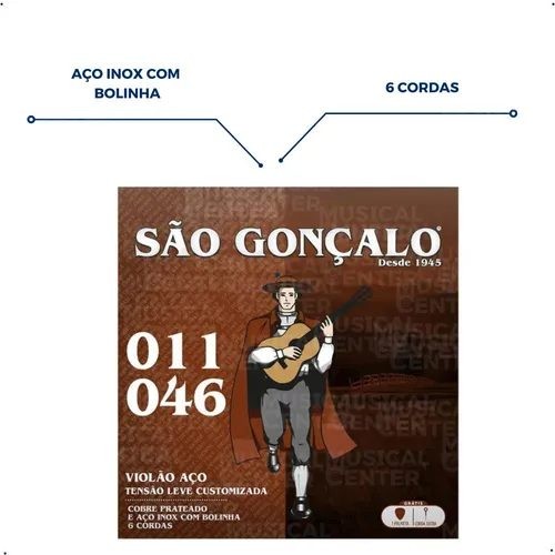 As cordas de violão São Gonçalo oferecem uma afinação precisa e durável. Esse encordoamento de aço revestido em cobre prateado vem com bolinhas, que servem para prender as cordas ao instrumento e facilitar a identificação de cada uma delas. Com tensão média, o encordoamento de violão 011 em aço garante uma afinação precisa e durável. Além disso, sua composição garante maior durabilidade e proteção contra oxidação. Por isso, é uma ótima escolha que combina qualidade e economia. A São Gonçalo surgiu em 1918 na Praça Marechal Deodoro da Fonseca em São Paulo e deu início aos seus serviços, oferecendo cordas de violão de alta qualidade para milhares de músicos do mundo.