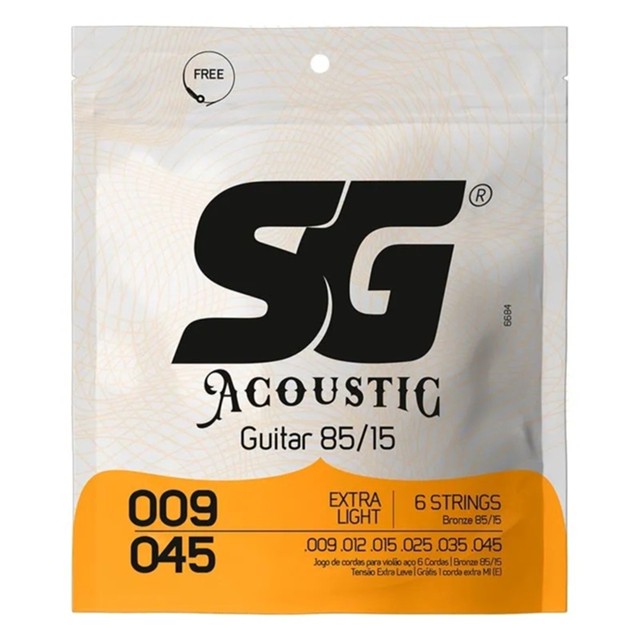 ENCORDOAMENTO SG VIOLAO AÇO 009 BRONZE 85-15 As cordas de tensão Extra Light são ideais para músicos que utilizam menor pressão nas mãos ou que prefiram uma sonoridade mais suave, menos encorpada e com poucos agudos. Em solos ou palhetadas, o timbre é sempre limpo e contagiante, seja qual for o estilo musical. Encordoamento que, além de um equilíbrio sonoro sensacional, traz a verdadeira sensação do folk. Com timbre quente e brilho enriquecido, a linha 85/15 traz a matéria-prima mais equilibrada (em questão de durabilidade, conforto e som) dentre as usadas para instrumentos acústicos. SKU: 2626