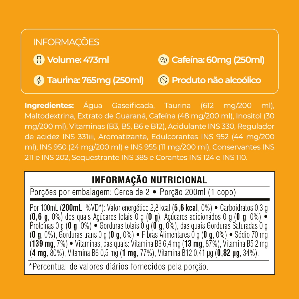 O Baly Morango e Pêssego Sem Açúcar preserva o equilíbrio entre as frutas em um sabor único, mas sem adição de açúcar e sem gosto residual de adoçante. Uma escolha perfeita pra quem busca mais energia com sabor de verdade. Combinando Taurina, Cafeína e Vitaminas do Complexo B, entrega foco, disposição e performance, seja no treino, na corrida ou apenas para quem quer o mesmo sabor e energia Baly, sem adição de açúcares. A lata de 473ml é ideal pra quem não abre mão de custo-benefício, oferecendo mais quantidade e energia em cada unidade, além de ser perfeita pra compartilhar com a galera. Sem açúcar de verdade Sem glúten Produto não alcoólico