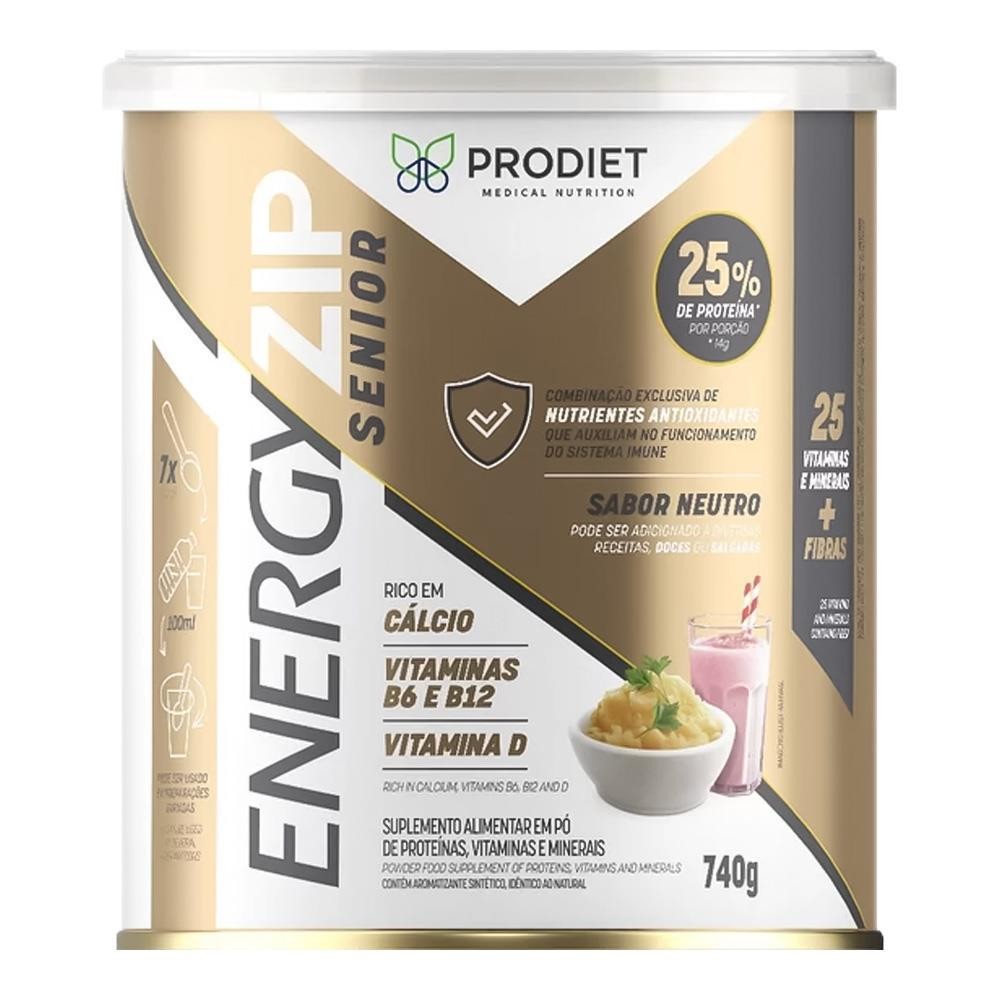 Energyzip Sênior com 740g ajuda com A suplementação em pó de proteínas, vitaminas e minerais, como o Cálcio, Vitaminas B6 e B12 e a Vitamina D, para o público com mais de 50 anos de idade.