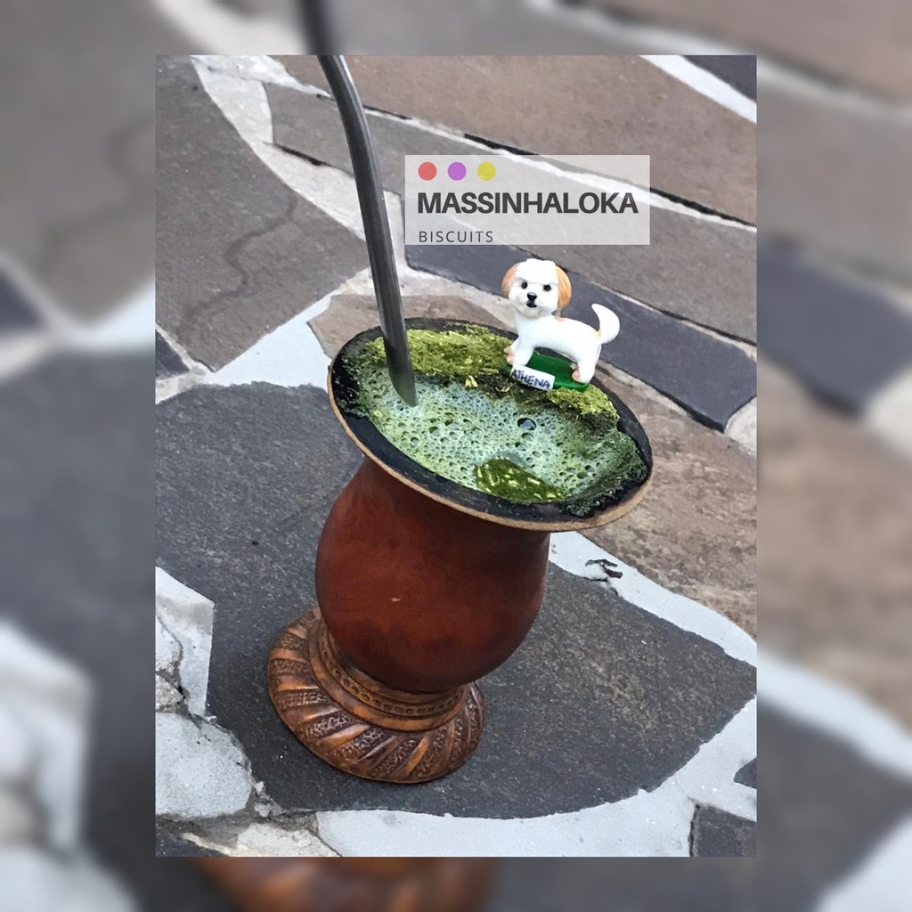 Enfeite de chimarrão modelado a mão em biscuit, com referência em fotos dos animais de estimação dos clientes. Valor referente a um animalzinho, se quiser mais de um animalzinho, você pode escolher se quer que fiquem na mesma base ou em bases separadas e coloque a quantidade no momento da compra. Feito sob encomenda. Me envie a foto via chat. ** Na base do enfeite existe um arame para fincar na erva ou na terra do vasinho de planta. Caso você prefira ter somente a miniatura na base, informe no chat. Qualquer dúvida só chamar! ;)