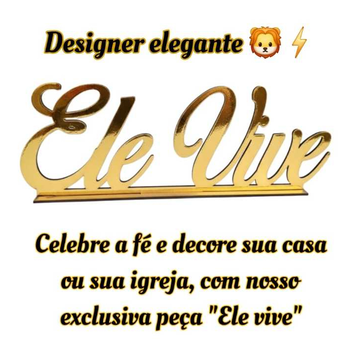 🌟 Enfeite de Mesa Decorativo "Ele Vive" - MDF de Alta Qualidade Celebre a fé e renove a decoração da sua casa com a nossa exclusiva peça "Ele Vive". Com um design elegante em letra cursiva e o detalhe da cruz, este enfeite é perfeito para aparadores, estantes, mesas de cabeceira ou para presentear alguém especial. Produzido com corte a laser de precisão, garantindo um acabamento impecável e sem rebarbas. ✨ Diferenciais do Produto: Material: MDF Premium de 3mm (resistente e leve). Tamanho Ideal: 29 cm de comprimento por 15 cm de altura – destaque garantido onde for colocado. Base Estável: Acompanha base de sustentação para ficar em pé perfeitamente. 🎨 Cores Disponíveis: Selecione a que melhor combina com seu estilo: Dourado Brilhante (Espelhado/Metalizado): Para um toque de luxo e sofisticação. Prata Brilhante (Espelhado/Metalizado): Modernidade e brilho sutil para ambientes clean. MDF Cru: Ideal para quem ama o estilo rústico ou deseja personalizar/pintar com sua própria cor. 📋 Especificações Técnicas: Comprimento: 29 cm Altura: 15 cm Espessura: 3 mm Conteúdo da Embalagem: 1 Escultura de mesa "Ele Vive" + Base. 💡 Dica de conservação: Para as opções brilhantes, utilize apenas um pano seco e macio para manter o brilho original. Envio rápido e embalagem segura para que sua peça chegue impecável!