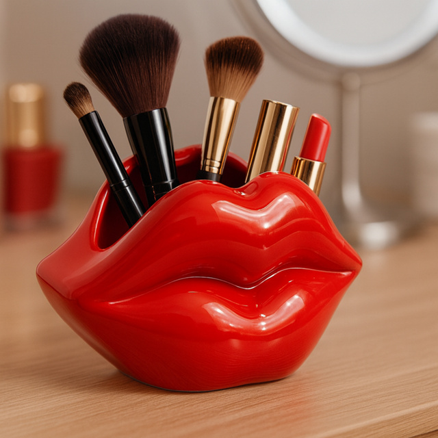 Enfeite Decoração Mesa Cerâmica e Porta Objetos e Porta Pincéis Delicado Lábios Vermelhos Boca