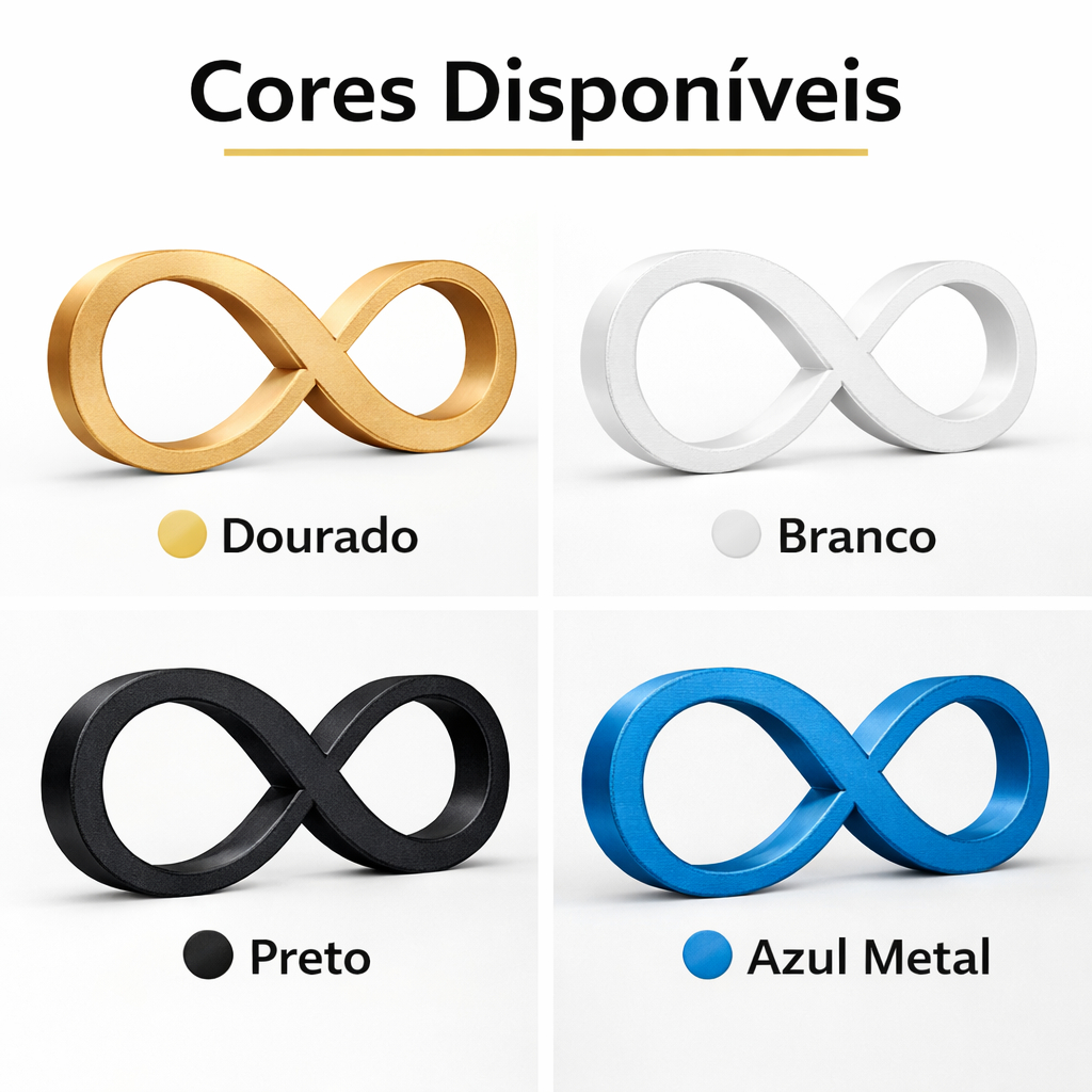 Enfeite Decorativo Símbolo do Infinito Minimalista para Sala, Mesa e Estante Leve mais charme e sofisticação para o seu ambiente com esta escultura decorativa em formato de símbolo do infinito. Um objeto decorativo moderno e versátil, ideal para quem busca uma decoração minimalista, elegante e fácil de combinar. Esse infinito decorativo é perfeito para compor decoração para sala, decoração para estante, enfeite para mesa, decoração para escritório, rack, aparador, nicho e quarto. Seu visual clean valoriza o ambiente sem pesar na composição, trazendo um toque moderno e sofisticado. Diferenciais do produto Design moderno e minimalista Ótimo como enfeite decorativo para sala, quarto e escritório Ideal como ornamento decorativo para estante, rack e aparador Produzido em impressão 3D com ótimo acabamento Peça leve, resistente e fácil de posicionar Combina com decoração moderna, decoração clean e ambientes elegantes Tamanhos disponíveis Pequeno: 17 cm de comprimento x 7 cm de altura Grande: 23 cm de comprimento x 9 cm de altura Cores disponíveis Dourado Branco Preto Azul Metal Material PLA (Plástico alta qualidade) conforme a cor escolhida. Conteúdo da embalagem 1 unidade da escultura decorativa símbolo do infinito Enviada na cor e no tamanho selecionados no anúncio Importante Produto decorativo As imagens ambientadas são ilustrativas As cores podem variar levemente conforme a iluminação e a tela do aparelho Por ser uma peça produzida em impressão 3D, pode apresentar marcas sutis características do processo de fabricação Perfeito para quem procura uma peça decorativa elegante, moderna e com personalidade para transformar a decoração de casa ou escritório.