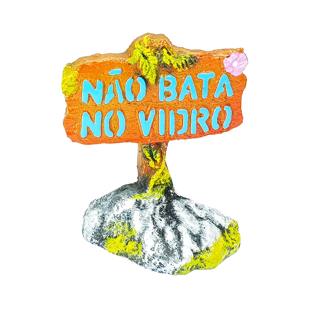 Enfeite para aquário Placa Não Bata No Vidro Com Pé Material de resina de poliéster para uso submerso em aquários de água doce ou salgada. Produto totalmente atóxico, pintura de alta durabilidade e compatível ao meio biológico. Medidas: Comprimento – 8 cm Largura – 4 cm Altura – 10 cm A Tonalidade das cores dos produtos podem variar de acordo com o lote.