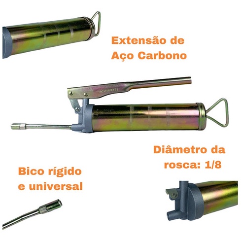 ***PRODUTO A PRONTO ENTREGA COM ENVIO IMEDIATO*** As bombas de graxa Starfer 400G é indicada para a lubrificação com graxa em máquinas e equipamentos que necessitam de pouca quantidade de graxa, acessório versátil e de fácil operação com capacidade para até 400 gramas. Este produto também conhecido por "Graxeira" é indicado para lubrificação de eixos, molas e peças em geral que exigem lubrificação para seu bom funcionamento. Itens inclusos: - 01 Bomba para graxa manual Starfer 02010011 Acompanha extensão rígida e flexível com bico. Características: - Material: Aço carbono. - Capacidade do reservatório 400 gramas. - Marca: Starfer. Garantia: 3 meses de garantia legal por lei, contando a partir da data de emissão da Nota Fiscal de Venda contra defeitos de fabricação.