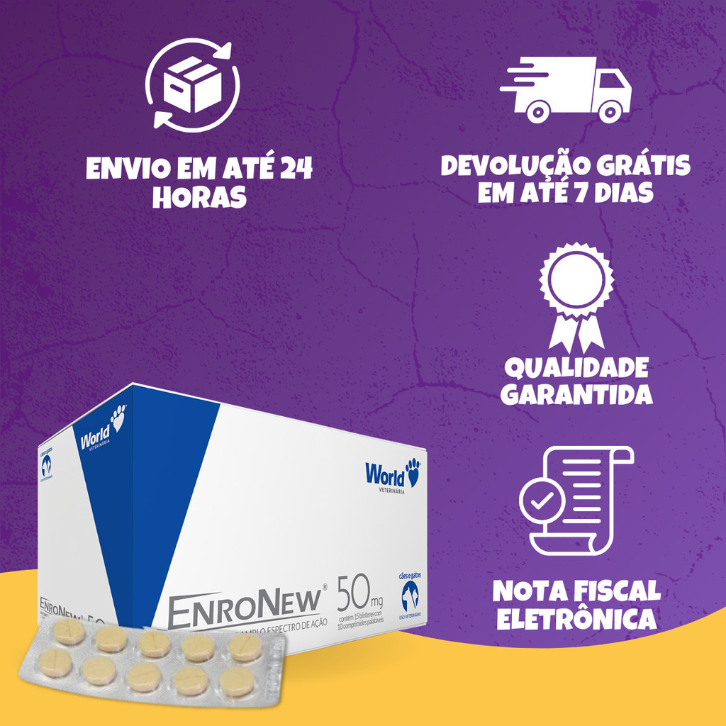 🐾 EnroNew 50mg World - Antibiótico de Amplo Espectro para Cães e Gatos Garanta a saúde e a recuperação rápida do seu melhor amigo! O EnroNew 50mg é um potente antimicrobiano à base de Enrofloxacina, desenvolvido especialmente para combater infecções em cães e gatos de pequeno e médio porte. ✨ Por que escolher o EnroNew? • Ação Rápida: Efeito bactericida que atua direto no DNA das bactérias, acelerando a cura. • Multiuso: Eficaz contra infecções de pele, ouvido (otites), respiratórias, urinárias e gastrointestinais. • Palatável: Comprimidos fáceis de administrar (seu pet aceita melhor!). • Segurança: Ideal para animais de até 10kg. 🩺 Indicações de Uso Este medicamento é indicado para o tratamento de infecções causadas por bactérias gram-positivas e gram-negativas, tais como: • Piodermites (infecções de pele) • Otites (infecções de ouvido) • Pneumonias e Bronquites • Diarreias Bacterianas • Cistites e infecções urinárias • Pós-operatório (prevenção de infecções) 📝 Informações Técnicas • Apresentação: Blíster com 10 comprimidos. • Dosagem: Cada comprimido contém 50mg de Enrofloxacina. • Porte: Raças pequenas e médias (até 10kg). • Idade: Adultos e Idosos. ⚠️ Cuidados e Contraindicações • Atenção: Não indicado para cães de raças pequenas/médias com menos de 18 meses e gatos com menos de 2 meses. • Uso sob orientação: Consulte sempre um Médico Veterinário para a dosagem correta conforme o peso do animal. • Armazenamento: Manter em local seco, fresco e longe do alcance de crianças.