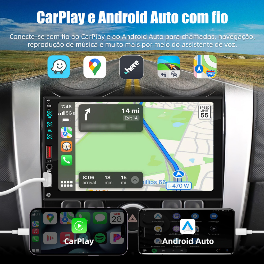 【Mirrorlink】 Suporta quase todos os mirrorlinks de smartphones iOS e Android. Sincronize seu smartphone com a tela grande e aproveite recursos como mapas, filmes e muito mais! O Mirror Link para Celular é compatível com Android 9.0 e versões anteriores; a versão do iPhone deve ser inferior a iOS 13.4; a resolução de todos os vídeos não pode exceder 1920*1080. 【CarPlay e Android Auto】 Os recursos integrados Apple CarPlay e Android Auto integram perfeitamente seu iPhone com a tela LCD capacitiva de 5 polegadas do aparelho e os controles via conexão USB. Agora você pode fazer chamadas, acessar suas músicas, enviar e receber mensagens, obter rotas e muito mais, mantendo o foco na estrada. Você também pode ativar a assistente de voz Siri para facilitar ainda mais a operação. 【Suporta entrada para câmera de ré】 O sistema exibirá a imagem automaticamente quando o veículo engatar a marcha ré, funcionando como um assistente de estacionamento. 【Rádio automotivo de 7 polegadas com Bluetooth 5.0 e FM】 - O Bluetooth 5.0 e o microfone permitem atender chamadas, ouvir músicas e sons de mídia de dispositivos com função Bluetooth. Faça chamadas telefônicas com as mãos livres - Liberte ambas as mãos discando e ouvindo uma chamada no rádio via conexão Bluetooth. Isso garantirá a segurança do seu caminho. Receptor estéreo de rádio FM de alta qualidade, modo de busca de canais FM, ouça música, notícias e informações de trânsito em qualquer lugar e divirta-se. Alguns dos principais recursos deste produto: 1) Resolução de 800 x 480, tela sensível ao toque HD capacitiva de 7 polegadas; 2) Suporta MirrorLink; 3) Suporta MirrorLink em quase todos os celulares Android e iOS; 4) Suporta entrada de vídeo para câmera de ré (câmera de ré HD à prova d'água incluída); 5) Chamadas viva-voz e transmissão de áudio via Bluetooth; 6) Carregador USB integrado: carregue seu celular enquanto usa o MirrorLink ou para carregamento de emergência; Rádio + Bluetooth + Reprodução via USB/cartão SD + Entrada auxiliar; 7) Equalização ajustável em 10 bandas; 8) Botões LED elegantes de 7 cores; 9) Suporta controle no volante; 10) Saídas para pré-amplificador e subwoofer - Você pode adicionar amplificador e subwoofer; 12) Controle remoto incluído; Conteúdo da Embalagem: 1*MP5 Player 1*Manual do Usuário 2*Cabo de Alimentação 1*Controle Remoto 1*Câmera de 12 LEDs (opcional)
