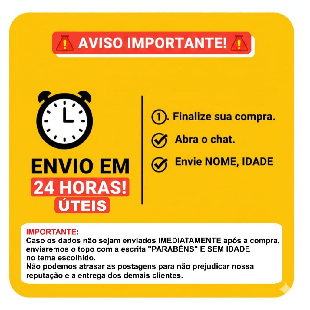 🔴Topo de bolo feito com corte digital.🔴 NÃO É 3D O topo de bolo inclui: ✅ Palitos para fixar no bolo ✅ Topo de bolo conforme a imagem ✅ Pode haver variações de cor devido a diferentes fatores, como a luz do dispositivo e a tela ✅ O topo chega pronto para você fazer a aplicação no bolo! 🚨Envie o nome e a idade IMEDIATAMENTE após a compra pelo chat; caso contrário, enviaremos a palavra "PARABÉNS" e sem idade, devido ao nosso compromisso com o prazo de envio.🚨 AS CORES DO CANUDO DO NOME PODE VARIAR DE ACORDO COM NOSSO ESTOQUE, MAS SEMPRE RESPEITANDO A PALETA DE CORES DO TEMA! ⚠As dimensões máximas do topo são para um bolo de até 25cm de largura.⚠ Use o campo de perguntas para esclarecer todas as suas dúvidas antes da compra! Composição: Papel fotográfico glossy 180g Palitos em acrílico INFORMAÇÕES IMPORTANTES: ⏰Esteja atento ao prazo de entrega fornecido pela Shopee no momento da compra. Por ser um produto personalizado e artesanal, temos até 2 dias úteis para preparação e envio, além do prazo da transportadora. Faça sua compra com antecedência! Planeje-se para evitar que esses imprevistos prejudiquem a sua festa 🥳 👍 trabalhamos com diversos temas👍 Caso não encontre algum tema, pode chamar um de nossos vendedores! Teremos um enorme prazer em atendê-lo e faremos tudo com muito carinho para que sua festa seja muito especial!!