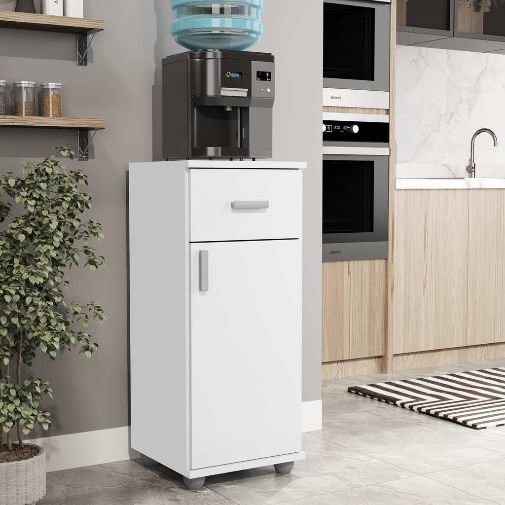 Armário Balcão Multiuso Suporte para Bebedouro Anna O Armário Balcão Multiuso Anna é um móvel prático e funcional ideal para sua cozinha, área gourmet, ambiente comercial ou escritório! Possui 1 porta e 1 gaveta com amplo espaço interno para guardar seus utensílios,pés resistente que trazem firmeza para o móvel e facilitam na hora da limpeza. E ainda conta com espaço externo para acomodar seu galão ou filtro de água. Perfeito para quem busca praticidade! Linha: Cozinha; Material da estrutura: MDP; Acabamento: Pintura; Quantidade de portas: 01; Material de dobradiças: Metálicas; Quantidade de gavetas: 01; Material das corrediças : Metálicas; Com puxador: Sim; Condição do item: Novo; Requer montagem: Sim (kit montagem incluso); Embalagem do envio: Papelão e plástico; Informações adicionais: Os objetos que ambientam as fotos não acompanham o produto; O produto será entregue desmontado; É de inteira responsabilidade do cliente a montagem do produto e/ou instalação, custos de transporte por escadas e/ou elevadores, guincho ou içamento, assim como possíveis avarias provenientes de manuseio inadequado; Embora o produto acompanhe o manual de montagem, verifique a complexidade antes de decidir montá-lo sozinho, recomendamos que contrate um profissional de sua confiança; Fique atento, nossas cores podem sofrer alterações dependendo do seu monitor; ANTES DE MONTAR O SEU PRODUTO, certifique-se que todas as instruções dispostas no manual, bem como todas as ferragens descritas, estejam presentes dentro da embalagem. Verifique se há alguma peça avariada, caso esteja, prestaremos a devida assistência dentro do prazo da garantia. Dimensões do produto montado 86 cm de altura 36 cm de largura 36 cm de profundidade