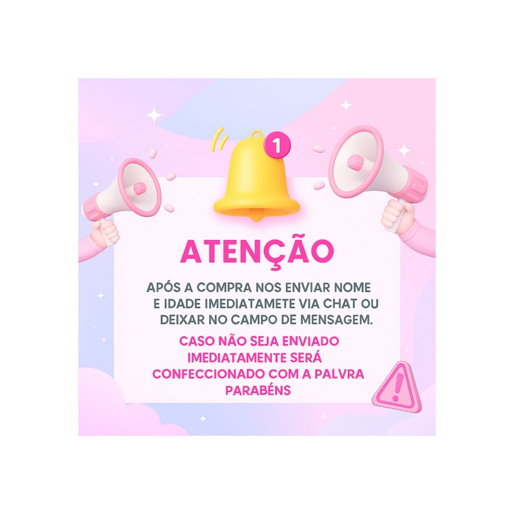 🎉 Seja bem-vindo à loja BM! 🎉 Dê um toque especial à sua festa com nossos topos de bolo personalizados — feitos com carinho para tornar seu momento ainda mais inesquecível! 🛍️ COMO FUNCIONA: Após a confirmação do pagamento, envie pelo chat o nome e a idade para personalização no prazo máximo de 24 horas, assim garantimos uma produção rápida e a entrega dentro do prazo. ⚠️ Caso os dados não sejam enviados dentro desse período, o topo será produzido conforme a imagem do anúncio, com a palavra "Parabéns", para não comprometer o prazo de envio. 📦 O QUE VOCÊ RECEBE: ✔️ 1 topo de bolo, ideal para bolos de 15 a 20 cm de diâmetro e de 10 a 12 cm de altura ✔️ Recorte feito em máquina profissional ✔️ Já montado com palitos colados, pronto para uso! ✨ ESCOLHA O SEU MODELO: 🔹 Modelo Simples: Feito com papel fotográfico 180g (sem camadas) 🔹 Modelo 3D (em camadas): Feito com papel colorido 180g, papel fotográfico 180g e/ou papel dourado 250g para um acabamento mais sofisticado 🎨 IMPORTANTE: As cores do produto podem variar levemente em relação à foto, dependendo da configuração da tela do seu dispositivo. 📅 PRAZOS: Confira com atenção o prazo total de entrega indicado pela plataforma (produção + transporte). Não finalize a compra se o prazo final ultrapassar a data da sua festa. Não trabalhamos com pedidos de urgência. 🧼 CUIDADOS E ARMAZENAMENTO: Guarde em local seco e protegido da luz solar direta.