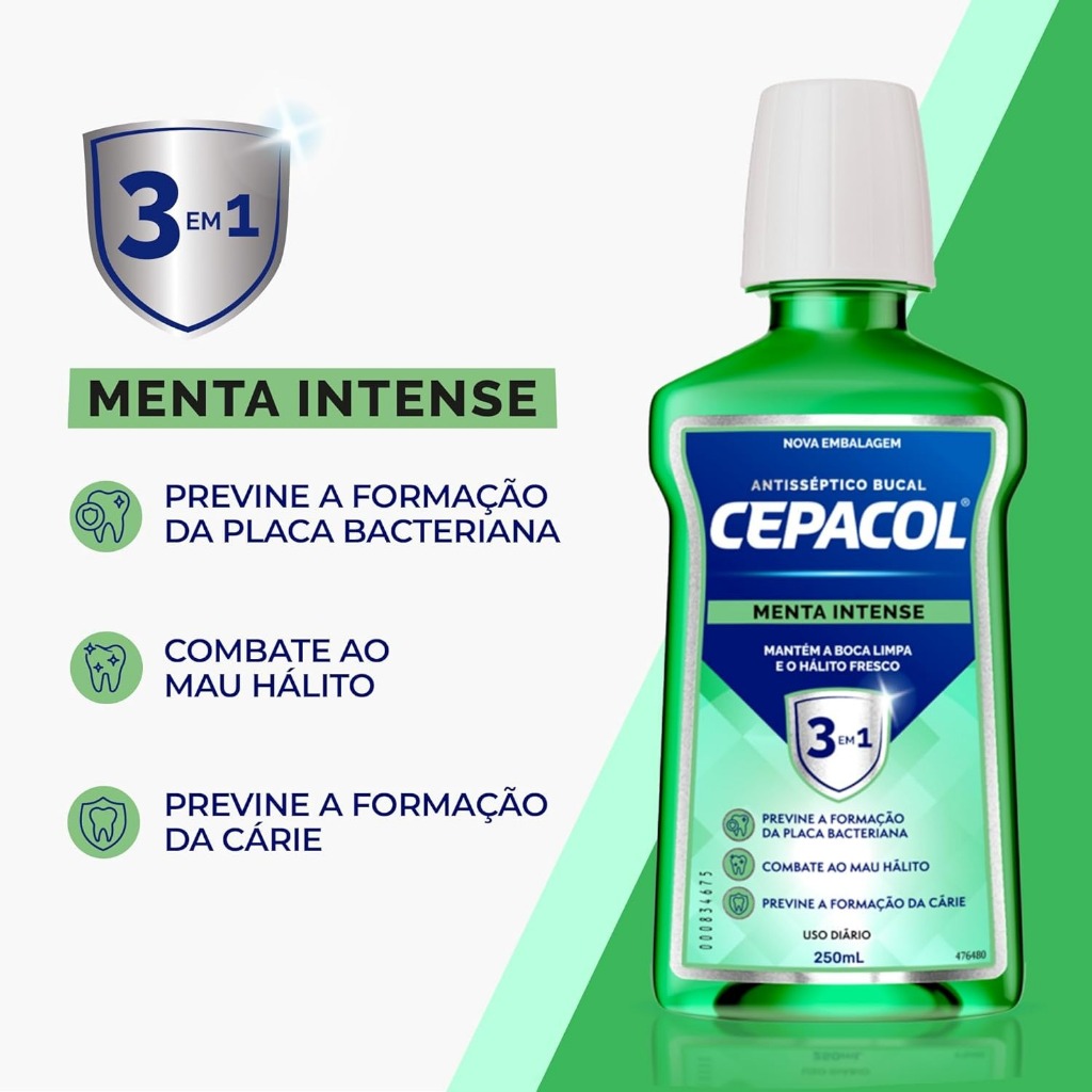 Enxaguante Bucal Cepacol Menta 250ml Principais Características: • Fórmula com ação antisséptica que auxilia no combate às bactérias causadoras do mau hálito. • Sabor refrescante de menta que prolonga a sensação de frescor na boca. • Ajuda a complementar a higiene bucal, alcançando áreas que a escovação não atinge. Benefícios: • Reduz a formação da placa bacteriana. • Combate o mau hálito e promove hálito fresco por mais tempo. • Contribui para a manutenção da saúde bucal no dia a dia. Diferenciais do Produto: • Fórmula eficaz que oferece proteção extra após a escovação. • Produto de uma marca tradicional e referência em cuidados bucais. • Ideal para quem busca praticidade e eficácia em um único enxaguante. Especificações Técnicas: • Peso: 250ml Instruções de Uso: • Encha a tampa dosadora até a marca indicada. • Bocheche por aproximadamente 30 segundos, sem diluir o produto em água. • Use após a escovação dos dentes ou conforme orientação do dentista. Avisos e Precauções: • Uso externo. Não ingerir. • Manter fora do alcance de crianças. • Não utilizar em crianças menores de 6 anos. • Em caso de irritação, suspender o uso e procurar orientação médica. O que está incluso? • 1 Enxaguante Bucal Cepacol Menta 250ml ---- DÚVIDAS FREQUENTES ---- Os produtos são originais? Sim. Todos os nossos produtos são originais. Emitem nota fiscal? Sim. Emitimos nota fiscal para todos os pedidos.