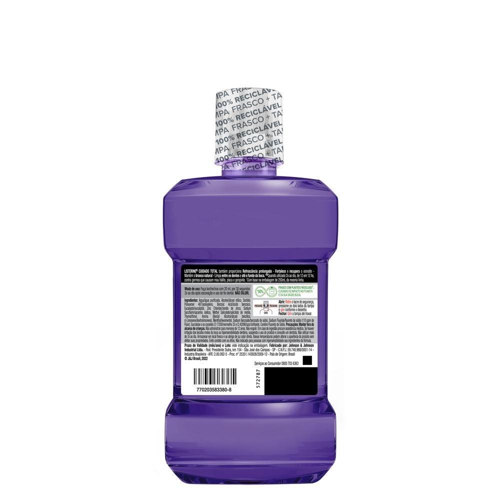 O que é e para que serve? Você sabia que os dentes são apenas 25% da sua boca? Por isso, apenas a escovação não garante uma limpeza completa. Adicione LISTERINE® Cuidado Total 14 Benefícios em 1 Enxaguante Bucal, 500mL à sua rotina e limpe aonde a escova não alcança, eliminando até 99, 9% dos germes* causadores de mau hálito, placa bacteriana e gengivite,e também prevenindo contra cárie e tártaro. Proporcionando dentes e boca mais saudáveis! Inclua LISTERINE® e limpe até 100% da sua boca. Benefícios e diferenciais Proteção anticáries Fortalece os dentes Recupera o esmalte Previne o tártaro Previne manchas Reduz a placa Gengivas saudáveis Mantém o branco natural Limpa entre os dentes e sob a gengiva Alcança até o fundo da boca Refrescância prolongada 24h de proteção* Elimina até 99,9% dos germes** Hálito fresco Fórmula exclusiva com agentes antibacterianos -O enxaguante n°1 do mundo Produto 100% reciclável (frasco e tampa) e feito com 30% de plástico reciclado Especialista em enxaguante bucal há mais de 140 anos *com uso de 12h em 12h, você tem 24h de proteção contra os germes que causam mau hálito, placa, gengivite, cáries e tártaro **germes que causam mau hálito, placa, gengivite, cáries e tártaro Como usar Utilize 2x ao dia, por 30 segundos, após a escovação e uso do fio dental. Para maiores de 12 anos, faça bochechos com 20 mL; e de 6 a 12 anos, utilize 10 mL (APENAS SEM ÁLCOOL). NÃO DILUIR. Composição LISTERINE possui fórmula clinicamente comprovada com 4 poderosos agentes antibacterianos, sendo eles Salicilato de metila, eucaliptol, timol e mentol. Além de Flúor que previne cáries e fortalece esmalte, e Cloreto de Zinco que previne a formação do tártaro. Aqua/água purificada, Sorbitol, Alcohol/álcool etílico, Poloxamer 407/poloxaleno, Benzoic Acid/ácido benzoico, Aroma (Cinnamal/cinamaldeído), Eucalyptol/eucaliptol, Zinc Chloride/cloreto de zinco, Sodium Saccharin/sacarina sódica, Methyl Salicylate/salicilato de metila, Thymol/timol, Sodium Fluoride/fluoreto de sódio (220 ppm de flúor), Menthol/levomentol, Sodium Benzoate/benzoato de sódio, Sucralose, CI 42090/azul brilhante, CI 16035/vermelho allura 129. Contém Fluoreto de sódio Precauções Não administrar para menores de 12 anos. Não engolir. Em caso de ingestão procure assistência médica. Se houver irritação dos tecidos moles da boca ou hipersensibilidade dentária, suspenda o uso do produto e consulte um dentista. Não utilizar mais de 2x ao dia. Armazenar em local fresco e ao abrigo de luz solar direta. Baixas temperaturas podem alterar a aparência do produto sem afetar suas propriedades. Evite contato com os olhos. Não indicado para pessoas com hipersensibilidade aos ingredientes da fórmula