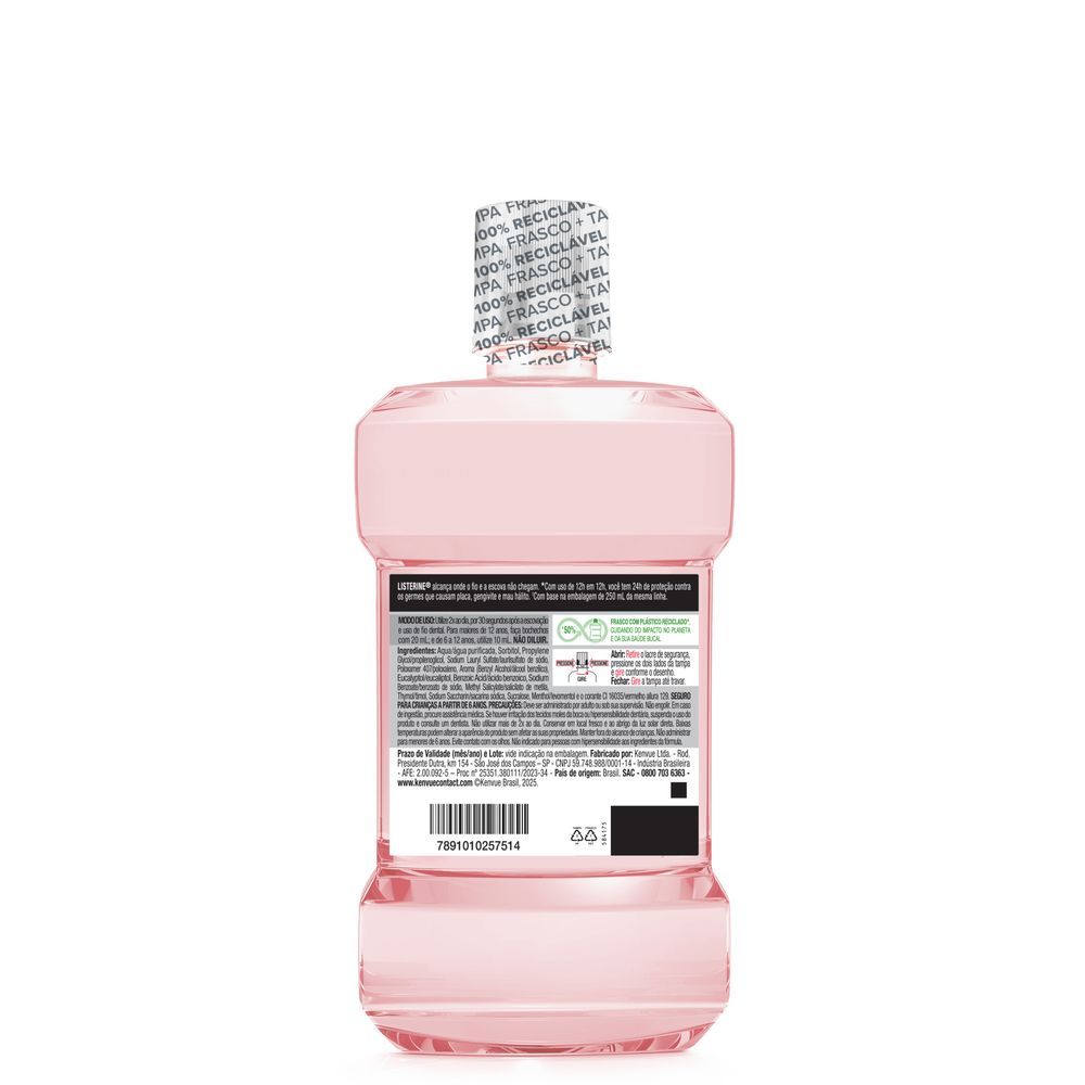 ?que é e para que serve? Você sabia que os dentes são apenas 25% da sua boca? Por isso, apenas a escovação não garante uma limpeza completa. Adicione LISTERINE® Melancia & Hortelã Enxaguante Bucal Sem Álcool, 1L à sua rotina e limpe aonde a escova não alcança, eliminando até 99% dos germes* causadores de mau hálito, placa bacteriana e gengivite. Inclua LISTERINE® e limpe até 100% da sua boca. Benefícios e diferenciais - Refrescância Suave de Melancia & Hortelã - Sem álcool -Mais proteção contra mau-hálito, placa e gengivite*. *vs. somente escovação -Fórmula exclusiva com agentes antibacterianos -O enxaguante n°1 do mundo -Mata até 99,9% dos germes que causam os principais problemas bucais -Produto 100% reciclável (frasco e tampa) e feito com 50% de plástico reciclado -24 horas de proteção com o uso a cada 12 horas -Especialista em enxaguante bucal há mais de 140 anos