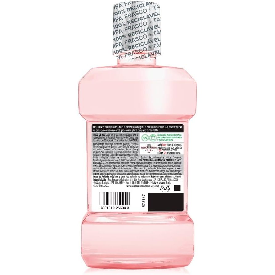 Enxaguante Bucal Listerine Melancia & Hortelã Sem Álcool 250ml O Enxaguante Bucal Listerine Melancia & Hortelã Sem Álcool 250ml oferece uma experiência refrescante e inovadora, unindo a suavidade do sabor da melancia com o frescor da hortelã. Com fórmula sem álcool e ação antisséptica eficaz, é ideal para quem busca proteção bucal diária com mais conforto e um toque de sabor diferenciado. 🦷 Principais Características Combinação exclusiva de sabores: A mistura de melancia e hortelã oferece uma experiência refrescante, levemente adocicada e agradável, ideal para quem prefere sabores mais suaves e modernos. Fórmula sem álcool: Proporciona uma sensação mais confortável durante o uso, sem ardência, sendo perfeita para usuários com boca sensível ou que buscam uma alternativa mais suave. Ação antisséptica eficaz: Elimina até 99% dos germes que causam mau hálito, placa bacteriana e gengivite, ajudando a manter a boca limpa e saudável quando utilizado diariamente. ✅ Benefícios Combate germes causadores de mau hálito e gengivite Proporciona hálito fresco e agradável com sabor leve Sensação de limpeza sem ardência Ideal para quem busca sabores diferentes e suaves Complementa a escovação e uso do fio dental Uso diário seguro e eficaz 🌟 Diferenciais do Produto Sabor inusitado e refrescante: melancia com hortelã Sem álcool: mais suavidade e conforto durante o uso Produto inovador da marca Listerine, referência mundial em cuidados bucais Volume ideal (250ml): perfeito para uso pessoal e para levar em viagens 📦 Especificações Técnicas Peso: 280g (aproximadamente) 📝 Instruções de Uso Após escovar os dentes, use 20ml do produto puro. Bocheche por 30 segundos e elimine o líquido. Não é necessário enxaguar com água. Utilize duas vezes ao dia, preferencialmente pela manhã e à noite. ⚠️ Avisos e Precauções Não indicado para crianças menores de 12 anos Não ingerir Em caso de irritação, suspenda o uso e consulte seu dentista Armazene em local seco, fresco e ao abrigo da luz solar direta Manter fora do alcance de crianças 📦 O que está incluso? 1 Enxaguante Bucal Listerine Melancia & Hortelã Sem Álcool 250ml ---- DÚVIDAS FREQUENTES ---- Os produtos são originais? Sim. Todos os nossos produtos são originais. Emitem nota fiscal? Sim. Emitimos nota fiscal para todos os pedidos.