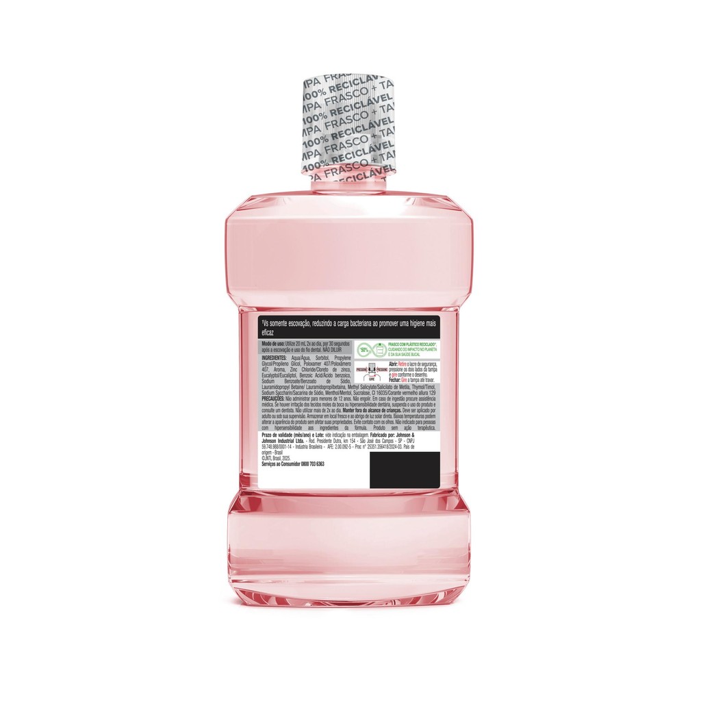 O que é e para que serve? Você sabia que os dentes são apenas 25% da sua boca? Por isso, apenas a escovação e o fio dental não garantem uma limpeza completa. Adicione LISTERINE® Profissional Gengiva Expert é a fórmula de cuidado bucal mais avançada de LISTERINE®. Com máxima concentração de Zinco, elimina até 99,9% dos germes que causam a gengivite bacteriana e seus sintomas. Na primeira semana de uso, reduz sangramentos em 58%, proporcionando alívio. Sua fórmula exclusiva com 4 óleos essenciais é segura e pode ser utilizada diariamente. Benefícios e diferenciais -Gengivas 4x mais saudáveis com redução e controle da gengivite em 1 semana¹ - O enxaguante n°1 do mundo - Elimina instantaneamente até 99,9% dos germes que causam: gengivite, vermelhidão - Menta Fresca - Produto 100% reciclável (frasco e tampa) e feito com 50% de plástico reciclado -Especialista em enxaguante bucal há mais de 140 anos ¹Vs somente escovação, reduzindo a carga bacteriana ao promover uma higiene mais eficaz. Modo de uso: Utilize 2x ao dia, por 30 segundos, após a escovação e uso do fio dental. Para maiores de 12 anos, faça bochechos com 20 mL; e de 6 a 12 anos, utilize 10 mL. NÃO DILUIR. Composição LISTERINE possui fórmula clinicamente comprovada com 4 poderosos agentes antibacterianos, sendo eles Salicilato de metila, eucaliptol, timol e mentol. Aqua/água, Propylene Glycol/Propileno Glicol, Sorbitol, Poloxamer 407/Poloxâmero 407, Aroma, Zinc Chloride/cloreto de zinco, Eucalyptol/Eucaliptol, Benzoic Acid/ácido benzoico, Sodium Benzoate/Benzoato de Sódio, LAURAMIDOPROPYL BETAINE, Methyl Salicylate/Salicilato de Metila, Thymol/Timol, Menthol/Mentol, Sodium Saccharin/Sacarina de Sódio, Sucralose, CI 16035/corante vermelho allura 129 Precauções Não administrar para menores de 12 anos. Não engolir. Em caso de ingestão procure assistência médica. Se houver irritação dos tecidos moles da boca ou hipersensibilidade dentária, suspenda o uso do produto e consulte um dentista. Não utilizar mais de 2x ao dia. Manter fora do alcance de crianças. Deve ser aplicado por adulto ou sob sua supervisão. Evite contato com os olhos. Não indicado para pessoas com hipersensibilidade aos ingredientes da fórmula. ?