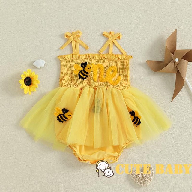 Eph-Infantil Bebê Meninas Aniversário Macacão Vestido Abelha Carta Bordado Sem Mangas,0-18 Meses