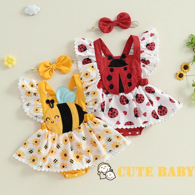 Eph-Infantil Bebê Meninas Vestido Macacão Estampado Abelha/Joaninha Com Tiara,0-18 Meses
