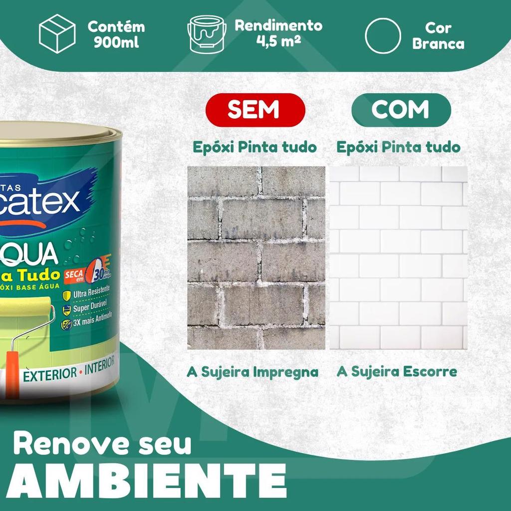 QUER RENOVAR azulejos, pisos, ou superfícies metálicas de forma prática e eficiente? A Tinta Eucatex Epóxi Base Água é a solução perfeita para quem busca alta durabilidade, resistência e facilidade de aplicação. Seja para renovar cozinhas, banheiros, ou qualquer área de grande circulação, essa tinta foi projetada para multi superfícies, como azulejos, madeira, metal e mais. Aqui está o que torna esse produto ideal para sua reforma PARA QUAIS SUPERFÍCIES FUNCIONA? Esta tinta é a escolha perfeita para diversos tipos de superfícies: - AZULEJOS E PASTILHAS: Renove paredes de banheiros e cozinhas com brilho e resistência. - MADEIRA E ALVENARIA: Deixe portas, móveis e paredes como novos. - METAIS FERROSOS E NÃO FERROSOS: Ideal para janelas, portões e outras estruturas metálicas. - PISO E PAREDE DE CIMENTO E CERÂMICO: Sua fórmula resiste ao tráfego intenso, tanto para superfícies internas quanto externas. - PAREDES E TETOS: Proporciona um acabamento semi-brilhante, elegante e resistente. VANTAGENS: FÁCIL DE APLICAR E SECAGEM RÁPIDA – Por ser monocomponente, não precisa de misturas complicadas. Pode ser aplicada com rolo, pincel ou pistola. USO EM QUALQUER LUGAR – Pode ser utilizado em paredes, rejuntes, tetos, pisos, azulejos, pastilhas, metais, portões, madeira, alvenaria, vidros, cimento, telhas, cozinhas, banheiros, piscinas, e muito mais! DURABILIDADE EXTREMA – Especialmente desenvolvida para áreas que exigem limpeza constante, como banheiros, cozinhas, pisos de cimento e cerâmicos, portões de ferro, madeira etc. ANTI MOFO PROTEÇÃO TRIPLICADA – Tripla proteção contra mofo e alta durabilidade, ideal para ambientes úmidos. ACABAMENTO SEMI-BRILHO – Um toque de elegância, sem exageros, para suas superfícies. BAIXO ODOR – Sem o cheiro incômodo de solventes, a tinta é perfeita para ambientes internos. =============================================== - MODO DE APLICAÇÃO: - Diluição: Primeira demão com 20%, demais com 10%. - Secagem: Ao toque em 30 minutos, pronta para a próxima demão em 4 horas. Tráfego de pessoas após 48 horas, veículos após 72 horas. - Demãos: Recomenda-se 2 a 3 demãos para obter o acabamento ideal. ESPECIFICAÇÕES TÉCNICAS: * Conteúdo: 900ml * Rendimento: Uma lata de 900ml cobre até 4,5m² por demão. * Cor: Branca * Acabamento: Brilhante semibrilho, com alta durabilidade e resistência. * Aplicação: Aplicação: Rolo de lã, pincel ou pistola, com diluição em água. =============================================== • PERGUNTAS FREQUENTES: 1 – E se eu quiser colorir? Resposta: A tinta vem na cor branca, mas aceita pigmentação com corantes apropriados, caso você queira dar um toque de cor personalizado. 2 – Posso aplicar em um portão de ferro? Resposta: Sim, sua aplicação é perfeita em portões de ferro e madeira, com acabamento de esmalte sintético à base de água, garantindo proteção extra. 3 – Funciona em Porcelanato? Resposta: Sim, sua fórmula é ideal para superfícies como pisos de cimento, porcelanato e até cerâmicos. 4 – E se eu quiser pintar o banheiro ou a cozinha? Resposta: Perfeita! Sua resistência a mofo e sua durabilidade fazem dela uma escolha excelente para ambientes com alta umidade. Não espere mais! Garanta um acabamento profissional e duradouro em seus projetos. Compre agora e transforme seu espaço com a Tinta Epóxi Base Água 900ml, a escolha certa para quem não abre mão de qualidade.
