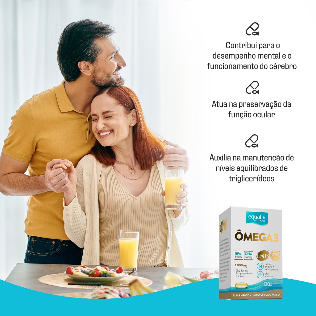 Equaliv Ômega 3 é um suplemento à base de óleo de peixe, rico em EPA e DHA, que auxilia na manutenção dos níveis saudáveis de triglicerídeos. Contém 90 cápsulas gelatinosas. Modo de uso: Consumir 1 (uma) cápsula, 3 vezes ao dia, antes das principais refeições ou conforme orientação do médico e/ou nutricionista. USO ADULTO. Ingredientes: Óleo de peixe, (gelificante) gelatina, (umectante) glicerol e (veículo) água purificada. “NÃO CONTÉM GLUTEN.” “ALÉRGICOS CONTÉM DERIVADOS DE PEIXE E PODE CONTER DERIVADOS DE AMENDOIM E SOJA.”