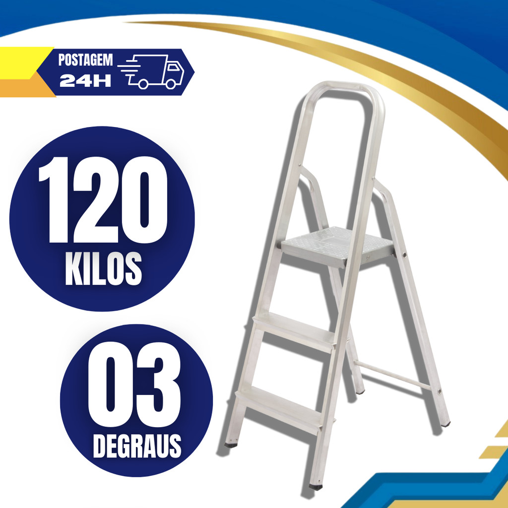 Especificações Técnicas: Material: Alumínio Capacidade: 120 kg Observações: Os objetos que ambientam as imagens não acompanham o produto! Garantia: 3 Anos (3 meses do vendedor, o restante com o fabricante) Itens Inclusos: 01 Escada em Alumínio 3 Degraus