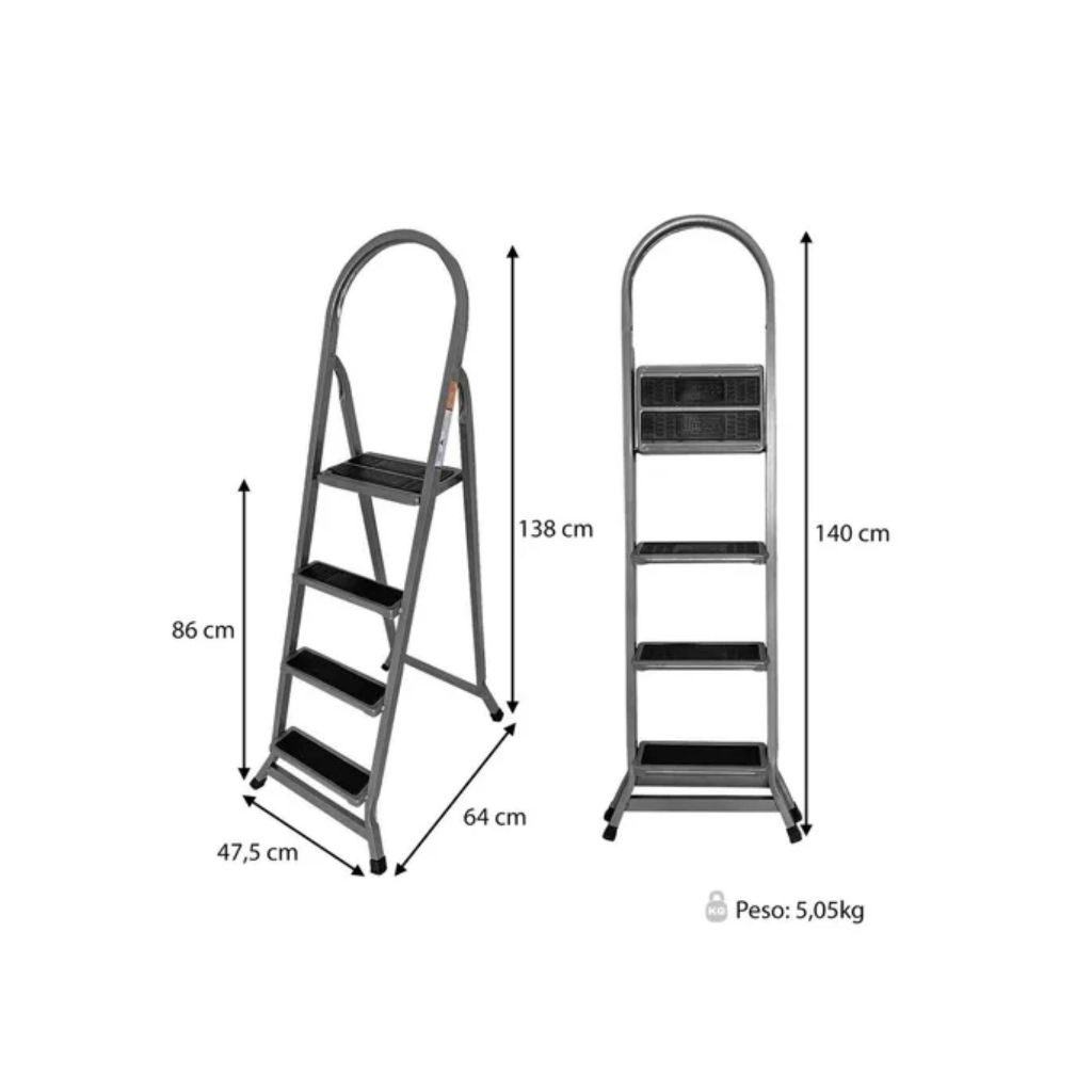 ** PRODUTO NOVO E ORIGINAL A PRONTA ENTREGA, ENVIO IMEDIATO ** Seja bem vindo à SOMEWAY STORE, estamos há mais de 15 anos vendendo online e em parceria com os melhores marketplaces do Brasil. Você tem 100% de garantia em receber nossos produtos bem embalados e de forma rápida. Em caso de qualquer problema de transporte ou defeito no produto, nossa equipe tem o compromisso em atende-lo e resolver da forma mais rápida e eficaz. *** ESCADA UTILAR 04 DEGRAUS *** Escada em aço com pintura eletrostática para uso doméstico. Leve e prática, é essencial para o dia-a-dia. Com apenas 10cm quando dobrada é bem fácil de guardar. É um produto certificado pela ABNT, órgão acreditado pelo Inmetro. Possui tapetes antiderrapantes e travas que garante maior segurança. *ESPECIFICAÇÕES DO PRODUTO* - Ponteiras de Borracha para não riscar o piso; - Dobrável; - Estrutura Reforçada; - Peso suportado: 120kg *COMPOSIÇÃO DO PRODUTO* Feito em Aço *O QUE VEM NA EMBALAGEM*: Contém: 1 Escada 4 Degraus *DIMENSÕES DO PRODUTO* Altura Aberta: 1380 mm Altura Fechada: 1400 mm Largura: 475 mm Altura Patamar: 860 mm *PRINCIPAIS DÚVIDAS* Os produtos são novos? R: Sim, trabalhamos somente com produtos novos. O produto está disponível em estoque? R: Sim, temos disponível em estoque Qual a durabilidade do material? R.: Alta resistência e durabilidade **OBS: IMAGENS MERAMENTE ILUSTRATIVAS ** ** RESPONSABILIDADE DA VENDA ** ** LOJA SOMEWAY **
