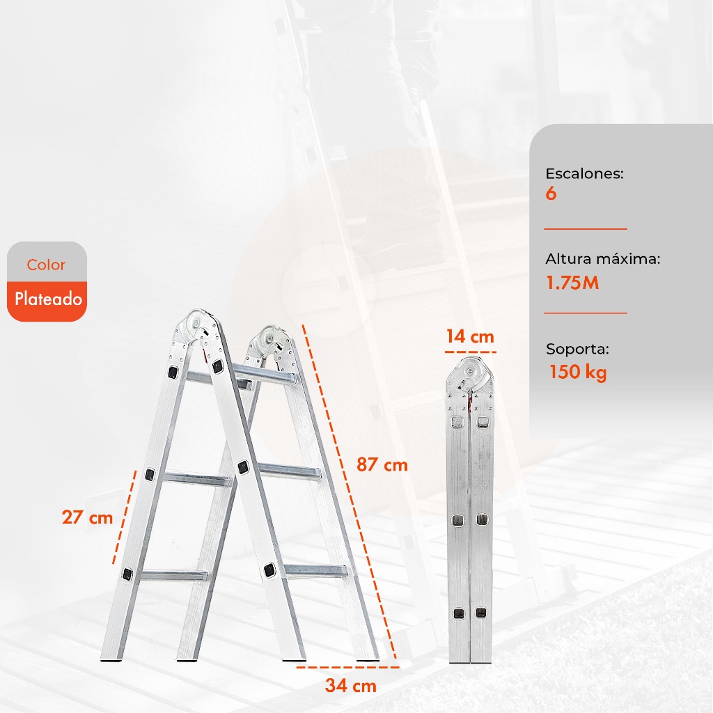 Conjunto Escada Multiuso: Versatilidade e Segurança para suas Tarefas Domésticas e Profissionais A escada multiuso é fabricada em alumínio de alta qualidade, garantindo uma estrutura compacta e fácil de transportar. Com uma resistência superior de até 150 kg, você pode confiar na sua durabilidade. Além disso, sua composição em alumínio previne o enferrujamento, enquanto os pés de borracha oferecem estabilidade e segurança, evitando deslizamentos indesejados. As dobradiças de aço e as travas de segurança proporcionam uma experiência livre de preocupações. Versatilidade para Todas as Necessidades ESCADA DE 6 DEGRAUS Escada em alumínio com 6 degraus de 1,75 metros de altura total. Altura máxima: 1,75 metros Altura Fechada: 0,87 cm Largura da escada: 0,34 cm Altura entre degraus: 0,27 cm