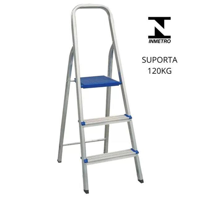 Escada 3 Degraus De Alumínio Resistente Escada Doméstica A Escada Residencial 3 degraus REAL é indicada para uso doméstico e para jardinagem, sendo versátil e prática no dia-a-dia! É em alumínio de liga especial Super resistente Degraus e sapatas antiderrapantes Trava de segurança em alumínio com articulação lateral Sistema de sustentação traseira em X Suporta até 120Kg Altura da escada residencial: Aberta: 112cm Fechada: 120cm Patamar: 66cm