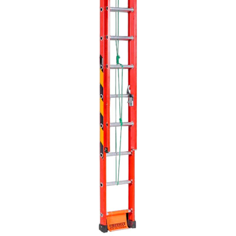 Escada de Fibra de Vidro 26 Degraus 5,40 x 9,60M EF5.4 FIBERMAX A Escada Extensiva Fibermax tem comprimento ajustável e é constituída por duas partes, uma fixa e outra móvel.Os perfis laterais das escadas Fibermax são confeccionados em fibra de vidro utilizando o moderno processo de Pultrusão.Esse processo possui diversas propriedades que fazem da escada um produto altamente resistente a intempéries, com elevada resistência mecânica e elétrica, imune a ataques químicos.Os degraus das escadas são fabricados com alumínio 6061 com espessura e formatos desenvolvidos para proporcionar alta resistência à tração, formato em D para maior conforto ao usuario.Todas as ferragens utilizadas são galvanizadas eletroliticamente e todas as porcas são autotravantes. DADOS TÉCNICOS: Faixas de segurança nas laterais em amarelo e preto dando para a escada maior segurança no manuseio.Catracas e moitões para lançamentos e recuo automáticos.Sapatas de borracha e antiderrapante.Cintas de apoio para poste.Arroelas de reforço estrutural em todos os degraus.Altura mínima: 5,40 metros.Altura máxima estendida: 9,60 metros. Ref: 09669Marca: FibermaxGarantia: 90 dias *Imagens meramente ilustrativas.