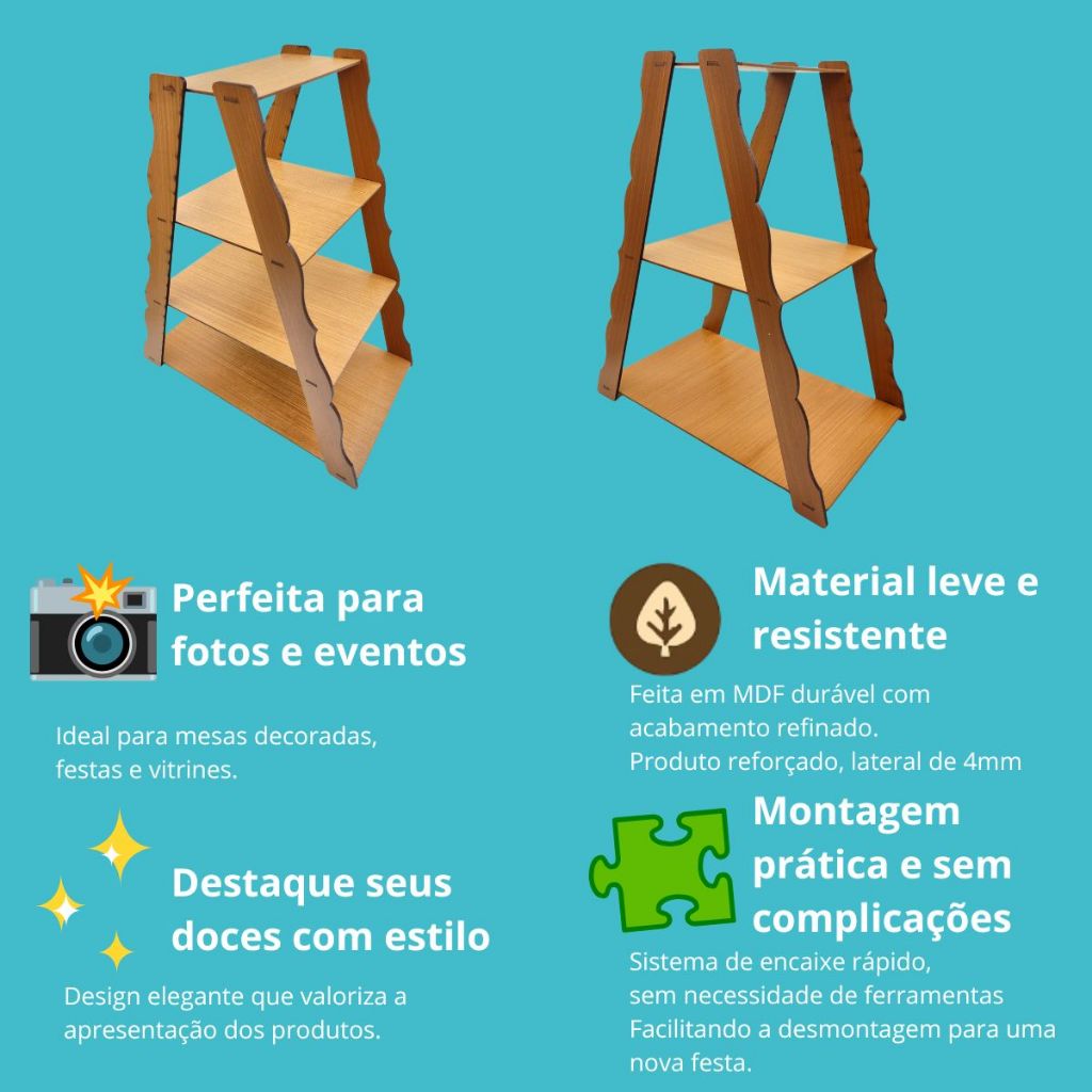 -Escada Porta Doces Em MDF - 3 Andares - Ideal Para Decoração de Festas e Eventos -Deixe sua mesa de doces ainda mais bonita, organizada e charmosa com a Escada Porta Doces em MDF! Uma peça funcional e decorativa, perfeita para destacar doces, cupcakes, lembrancinhas ou mini bolos em festas de aniversário, casamentos, batizados, chás de bebê ou qualquer evento especial. Fabricada em MDF de excelente qualidade, possui um design elegante e delicado, com 3 prateleiras que oferecem ótimo espaço para exposição. Prática, leve e fácil de montar! Características do Produto: -Material: MDF de alta qualidade -Acabamento: Madeira lisa com corte a laser -Composição: 3 prateleiras espaçadas em formato de escada -Envio desmontado (fácil montagem por encaixe) -Capacidade: Ideal para doces, cupcakes, bem-casados, lembrancinhas, mini bolos, etc. -Produto reutilizável e resistente Dimensões Aproximadas Montada: -Altura: 43 cm -Largura: 35,5 cm -Profundidade Total: 21 cm Prateleiras: 1º Andar: 35,5 cm 2º Andar: 22,5 cm 3º Andar: 11,0 cm Benefícios do Produto: -Design elegante que valoriza a decoração -Prática e fácil de montar e desmontar -Ideal para decoração de mesas em festas e eventos -Leve, resistente e reutilizável -Produto sustentável em MDF Indicações de Uso: -Decoração de festas de aniversário -Mesas de doces e sobremesas -Casamentos, batizados, chás revelação e eventos corporativos -Lojas de doces, confeitaria ou eventos personalizados -Enviamos com total proteção e segurança para todo o Brasil.