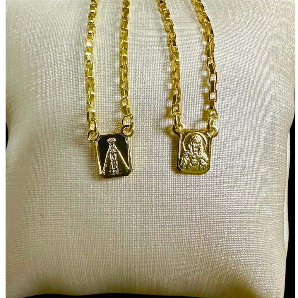 Escapulário Religioso Folheado a Ouro 18k – Nossa Senhora Aparecida e Sagrado Coração de Jesus Escapulário delicado e cheio de significado, ideal para expressar fé e devoção no dia a dia. Possui duas medalhas retangulares com acabamento liso e brilho intenso: de um lado Nossa Senhora Aparecida e do outro o Sagrado Coração de Jesus, símbolos de proteção, amor e espiritualidade. Detalhe do Produto Corrente de 70cm plaquinha de 8mm OBRIGADO PELA SUA COMPRA