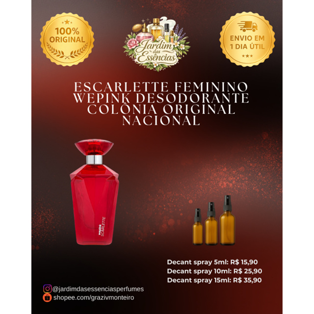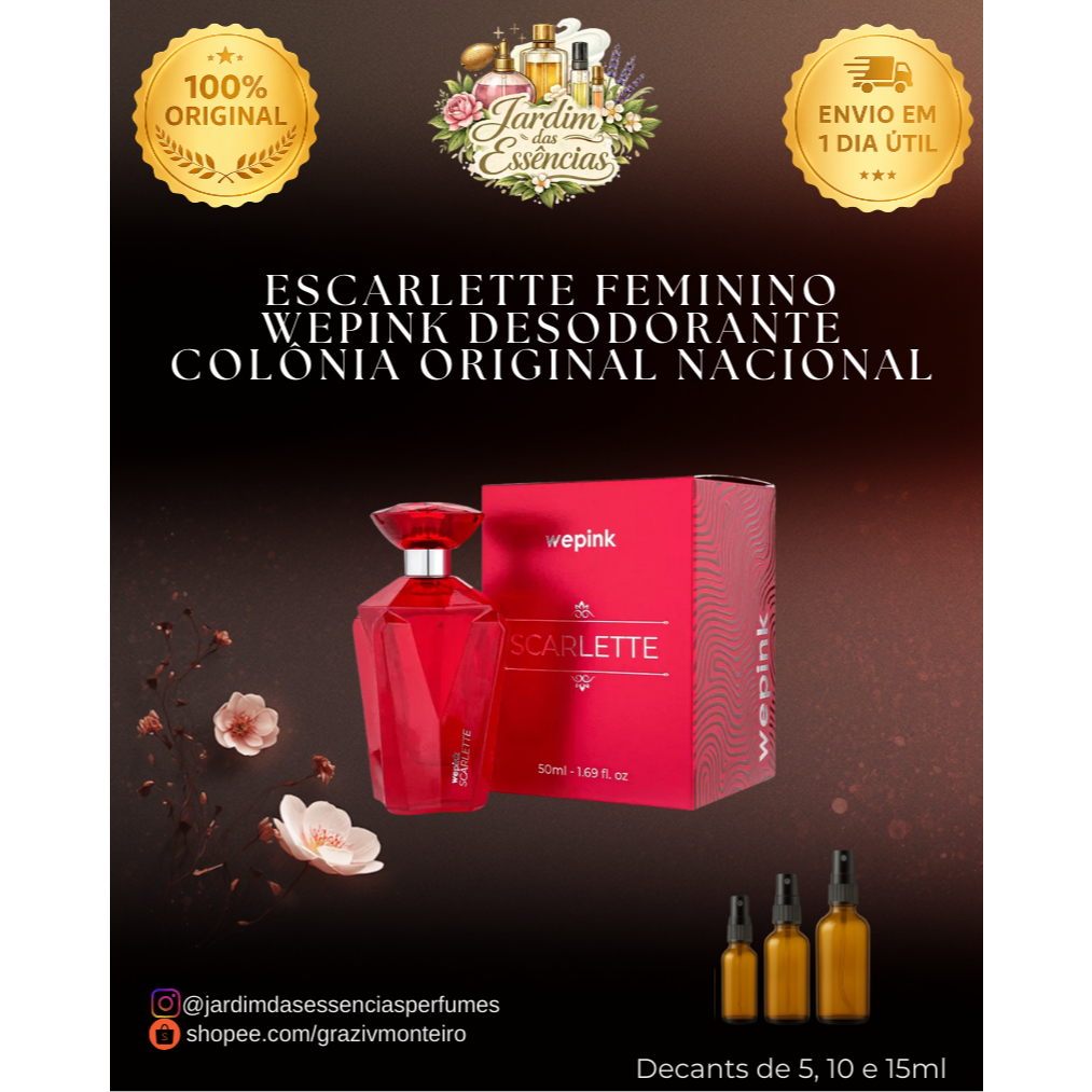 Perfume Escarlette Feminino WePink Desodorante Colônia Original Nacional 🌸 O Escarlette Feminino WePink Desodorante Colônia é uma fragrância feminina envolvente, moderna e delicada, perfeita para mulheres que gostam de perfumes doces, frutados e com toque floral elegante. Com uma abertura fresca e vibrante, seguida por um coração floral sofisticado e um fundo cremoso e aconchegante, o Escarlette entrega uma experiência olfativa feminina, charmosa e marcante na medida certa. 🌸 Família olfativa: Floral frutado feminino 💖 Perfil: fragrância feminina nacional, doce, elegante e envolvente 🎁 Excelente opção para presente feminino 🌺 Notas olfativas: Notas de Topo (Saída): – Morango – Laranja – Ameixa Abrem com um frescor cítrico e frutado intenso, trazendo alegria e leveza logo nas primeiras borrifadas. Notas de Coração (Corpo): – Violeta – Jasmim Revelam um bouquet floral delicado e feminino que traz sofisticação à fragrância. Notas de Fundo (Base): – Baunilha – Âmbar – Almíscar – Sândalo Proporcionam cremosidade, conforto e uma fixação doce e envolvente. 🕰️ Quando usar: Ideal para o dia a dia, encontros, passeios e momentos especiais em que você deseja uma fragrância feminina doce, elegante e agradável. ✅ Produto 100% original: – Desodorante Colônia WePink original – Produto nacional – Garantia de autenticidade 📦 Envio rápido Shopee: – Postagem em até 1 dia útil – Produto bem embalado e protegido O Escarlette WePink Feminino Desodorante Colônia possui fixação equilibrada e projeção agradável, ideal para quem busca um perfume feminino doce, frutado e sofisticado para diferentes momentos do dia.