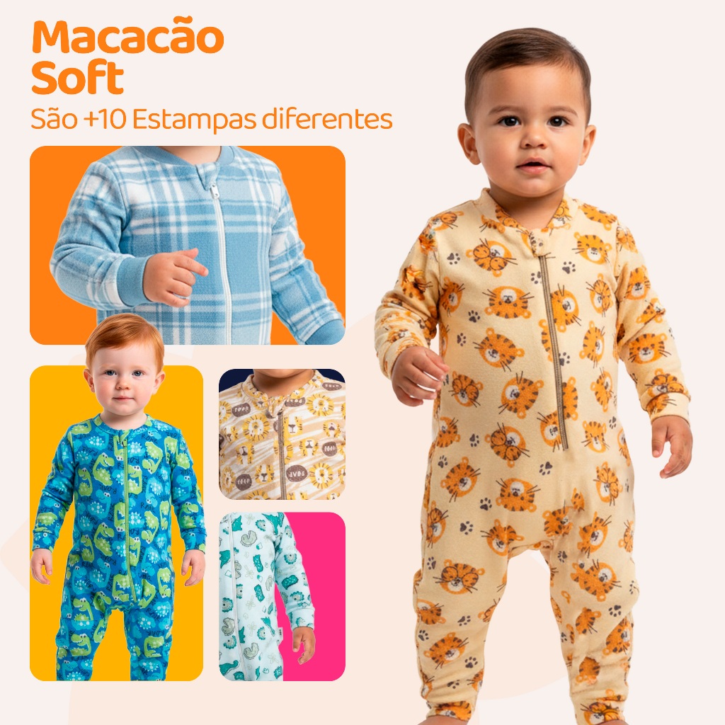 São leves, macios e ideais para os dias mais frios, com abertura em zíper que facilita muito na hora de vestir e trocar. Detalhes do Produto: Composição: 100% Poliéster (Soft) – Tecido leve, macio e quentinho Abertura frontal com zíper – Prático para vestir e trocar a fralda Punhos ajustados – Melhor caimento e conforto no corpo Uso versátil – Ideal para dormir, brincar em casa ou passear no inverno Sortido e funcional – Envio de modelos variados conforme disponibilidade de estoque Benefícios: Super confortável e quentinho Não amassa e seca rápido Macacões fáceis de vestir com zíper frontal