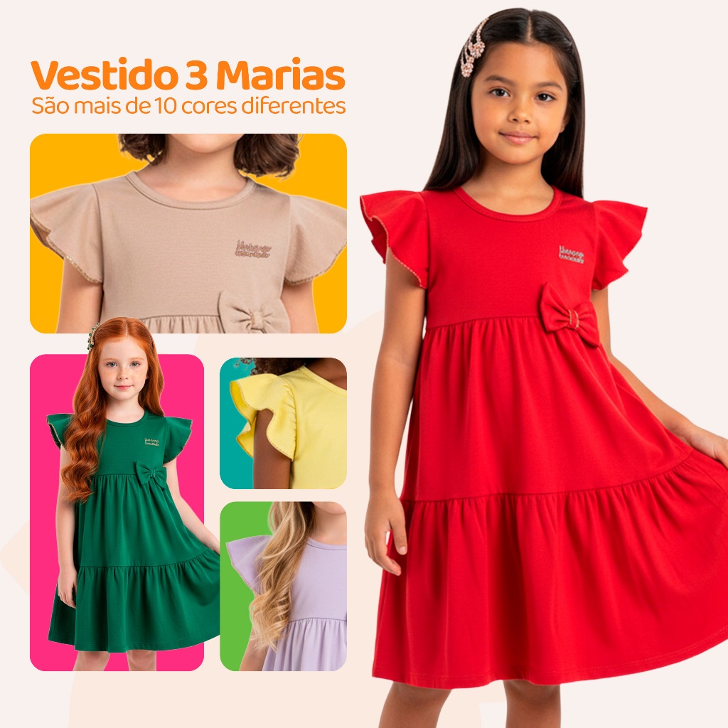 Conforto, leveza e muito charme para o dia a dia das meninas As peças têm caimento leve, toque suave e são ideais para usar na escola, em passeios, festinhas ou no dia a dia. Características do Produto - Vestido modelo 3 Marias: com recortes em camadas e leve franzido - Confeccionados em 100% algodão - Caimento leve e tecido respirável - Estilo casual e confortável Tabela de Medidas – Vestido Tam 1 – Busto 21 cm | Comprimento 50 cm | Ombro 18 cm Tam 2 – Busto 22 cm | Comprimento 51 cm | Ombro 20 cm Tam 3 – Busto 24 cm | Comprimento 53 cm | Ombro 21 cm Tam 4 – Busto 26 cm | Comprimento 58 cm | Ombro 24 cm Tam 6 – Busto 28 cm | Comprimento 60 cm | Ombro 25 cm Tam 8 – Busto 30 cm | Comprimento 64 cm | Ombro 26 cm Tam 10 – Busto 32 cm | Comprimento 65 cm | Ombro 28 cm Tam 12 – Busto 35 cm | Comprimento 68 cm | Ombro 30 cm > As medidas podem variar até 2 cm conforme o processo de confecção. FAQ – Perguntas Frequentes **1. Os vestidos são realmente 100% algodão?** Sim, todos os vestidos são feitos em malha leve 100% algodão. **2. Serve para dias quentes?** Sim. O tecido é leve, fresquinho e muito confortável.