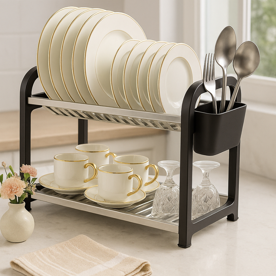 ESCORREDOR DE LOUÇA INOX – ORGANIZAÇÃO E ELEGÂNCIA NA SUA COZINHA Descubra o escorredor de louça Hev Store, que une design moderno e praticidade para deixar sua cozinha muito mais organizada. Com dois andares e capacidade para até 12 pratos, ele oferece espaço ideal para pratos, copos e talheres, mantendo tudo sempre seco e em ordem. Produzido em aço inoxidável e plástico de alta durabilidade, é resistente, fácil de limpar e possui um visual elegante que combina com qualquer estilo de decoração. A estrutura firme garante estabilidade, enquanto o porta-talheres removível otimiza o espaço e facilita o uso diário. Seu design inteligente evita acúmulo de água e mantém sua bancada sempre limpa. Compacto, é perfeito tanto para cozinhas pequenas quanto para quem busca mais eficiência no dia a dia. Bonito, prático e funcional, o Escorredor Inox Preto é ideal para quem valoriza praticidade, estilo e durabilidade. E mais: é uma ótima opção de presente para quem ama organização e quer transformar a rotina na cozinha. VANTAGENS DO PRODUTO: Capacidade para até 12 pratos, copos e talheres. Dois andares para melhor aproveitamento de espaço. Estrutura em aço inox 430 e plástico resistente Porta-talheres removível e prático. Design moderno e elegante na cor preta. Fácil de limpar e compacto para qualquer bancada. Evita acúmulo de água e mantém a pia seca. Alta durabilidade e acabamento sofisticado. MEDIDAS APROXIMADAS: Altura: 28,5 cm. Largura: 26 cm. Comprimento: 31,5 cm PERGUNTAS FREQUENTES: É inox? Sim, produzido em aço inoxidável 430. Cabe só pratos? Não, também copos, talheres e xícaras. Enferruja com o tempo? Não, o inox 430 garante resistência e longa durabilidade. Posso usar em bancada pequena? Sim, o design compacto se adapta a diferentes espaços. GARANTA O SEU HOJE MESMO! Organização, elegância e praticidade em um único produto. Envio rápido e atendimento confiável.