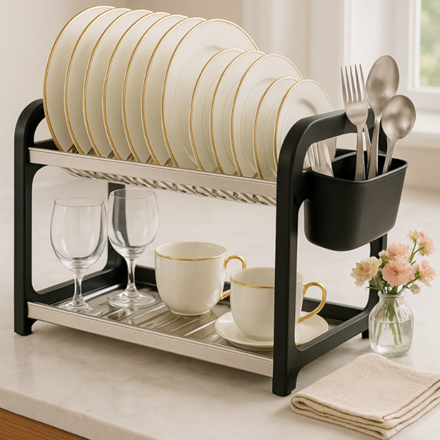 ESCORREDOR DE LOUÇA INOX – ORGANIZAÇÃO E ELEGÂNCIA NA SUA COZINHA Descubra o escorredor de louça Hev Store, que une design moderno e praticidade para deixar sua cozinha muito mais organizada. Com dois andares e capacidade para até 20 pratos, ele oferece espaço ideal para pratos, copos e talheres, mantendo tudo sempre seco e em ordem. Produzido em aço inoxidável e plástico de alta durabilidade, é resistente, fácil de limpar e possui um visual elegante que combina com qualquer estilo de decoração. A estrutura firme garante estabilidade, enquanto o porta-talheres removível otimiza o espaço e facilita o uso diário. Seu design inteligente evita acúmulo de água e mantém sua bancada sempre limpa. Compacto, é perfeito tanto para cozinhas pequenas quanto para quem busca mais eficiência no dia a dia. Bonito, prático e funcional, o Escorredor Inox Preto é ideal para quem valoriza praticidade, estilo e durabilidade. E mais: é uma ótima opção de presente para quem ama organização e quer transformar a rotina na cozinha. VANTAGENS DO PRODUTO: Capacidade para até 20 pratos, copos e talheres. Dois andares para melhor aproveitamento de espaço. Estrutura em aço inox 430 e plástico resistente Porta-talheres removível e prático. Design moderno e elegante na cor preta. Fácil de limpar e compacto para qualquer bancada. Evita acúmulo de água e mantém a pia seca. Alta durabilidade e acabamento sofisticado. MEDIDAS APROXIMADAS: Altura: 28,5 cm. Largura: 26 cm. Comprimento: 51 cm PERGUNTAS FREQUENTES: É inox? Sim, produzido em aço inoxidável 430. Cabe só pratos? Não, também copos, talheres e xícaras. Enferruja com o tempo? Não, o inox 430 garante resistência e longa durabilidade. Posso usar em bancada pequena? Sim, o design compacto se adapta a diferentes espaços. GARANTA O SEU HOJE MESMO! Organização, elegância e praticidade em um único produto. Envio rápido e atendimento confiável.