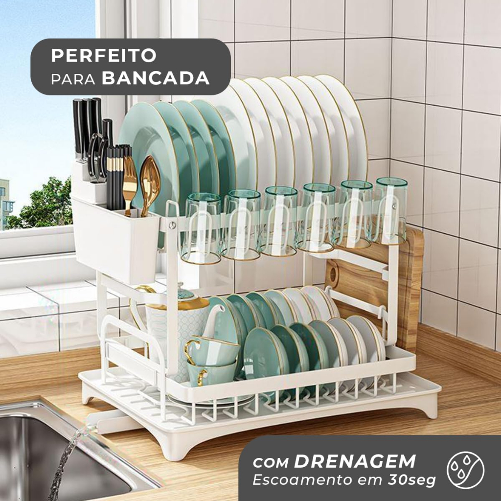 Escorredor De Louça Branco com Saída de Agua Em Inox Dois Andares Drenagem e Porta Talheres e Copos