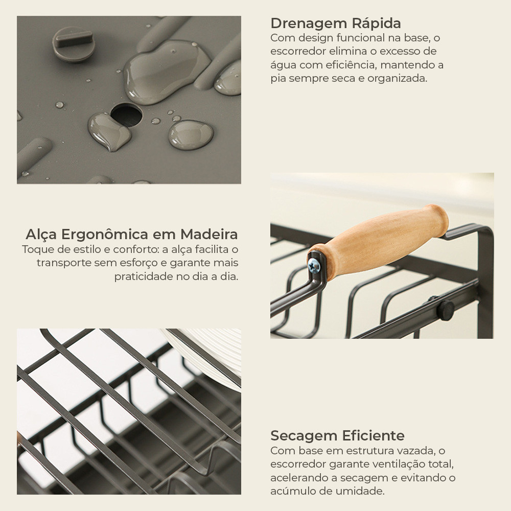 Com design compacto e funcional, o escorredor de louças Deend modelo D250324 é ideal para quem busca otimizar o espaço da cozinha sem abrir mão da praticidade. Com estrutura em aço resistente e pintura especial, ele oferece dois níveis de armazenamento bem distribuídos, acomodando pratos, bowls e utensílios com segurança e elegância. As alças ergonômicas em madeira trazem um toque de estilo e facilitam o transporte no dia a dia. O suporte superior comporta até 11 pratos, enquanto a base inferior é perfeita para bowls e copos. A bandeja coletora possui bico direcionável com rotação livre e ajuste de comprimento, permitindo escoamento rápido da água diretamente na pia. Conta ainda com suporte lateral removível para talheres, e base vazada que acelera a secagem, evitando acúmulo de umidade. Um escorredor completo, moderno e durável para transformar sua rotina na cozinha. Características: Marca: Deend Modelo: D250324 Material: Estrutura em aço com pintura resistente Capacidade superior: 11 pratos Capacidade inferior: 5 a 6 bowls ou copos Bandeja coletora: Com dreno ajustável e giratório Suporte de talheres: 1 unidade removível Alças: Madeira natural com acabamento envernizado Cor: Cinza escuro com detalhes em madeira Dimensões: 37 cm (altura) x 38 cm (comprimento) x 25 cm (largura) Peso: 1.7 kg Benefícios: Design elegante com alças em madeira Ocupa pouco espaço na bancada Dreno com rotação e ajuste para escoamento direto Base vazada que acelera a secagem Mais praticidade e organização na sua cozinha