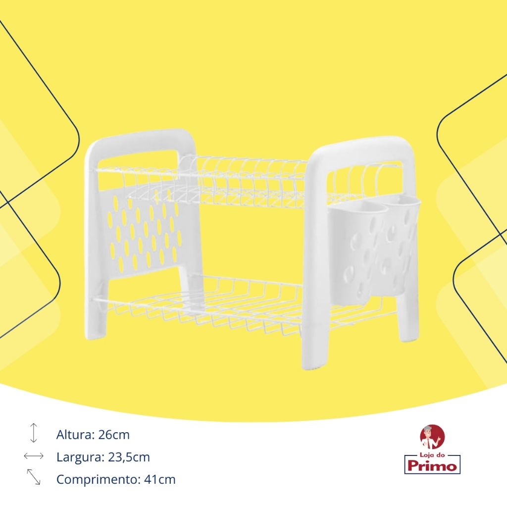 Escorredor Duplo Desmontável para 12 Pratos com Porta Talheres - Branco - Arthi Descrição: Organize sua louça de forma prática e elegante com o Escorredor Duplo Desmontável da Arthi. Com capacidade para até 12 pratos, ele também inclui um compartimento porta talheres, oferecendo uma solução completa para secar sua louça com estilo e eficiência. Ideal para quem busca praticidade sem abrir mão de um design clean na cor branca. Características: - Capacidade: Suporta até 12 pratos, além de talheres e copos. - Material: Plástico resistente, leve e durável, com estrutura firme para suporte seguro. - Design: Moderno e compacto, na cor branca, que combina facilmente com qualquer cozinha. - Desmontável: Fácil de montar e desmontar, facilitando a limpeza e o armazenamento. - Compartimento Extra: Porta talheres removível para mais organização. Benefícios: - Maximiza o espaço da sua pia com dois níveis, permitindo secar mais louças de forma organizada. - Fácil de desmontar, o que torna a limpeza prática e rápida. - O design elegante em branco oferece uma aparência clean, ideal para cozinhas de diferentes estilos. Evita o acúmulo de água na pia, mantendo a área sempre limpa e seca. O Escorredor Duplo Desmontável da Arthi é a solução ideal para quem valoriza organização e praticidade no dia a dia. Com capacidade generosa para louças e um design compacto, ele facilita a rotina na cozinha, além de garantir um ambiente sempre organizado e bonito. A escolha perfeita para facilitar suas tarefas sem comprometer o estilo! Loja do Primo Variedades.