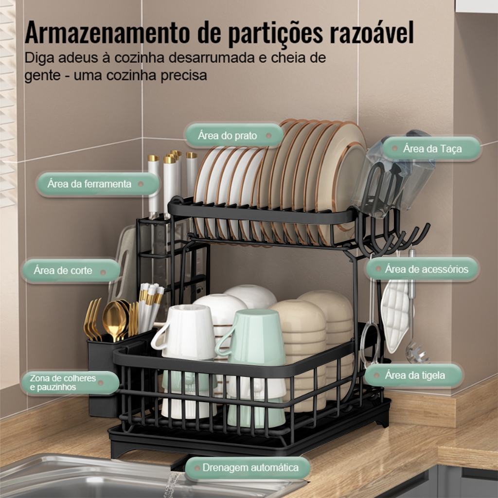 Escorredor de Louça Duplo Removível Com Níveis Dreno Cor Preto Yesop