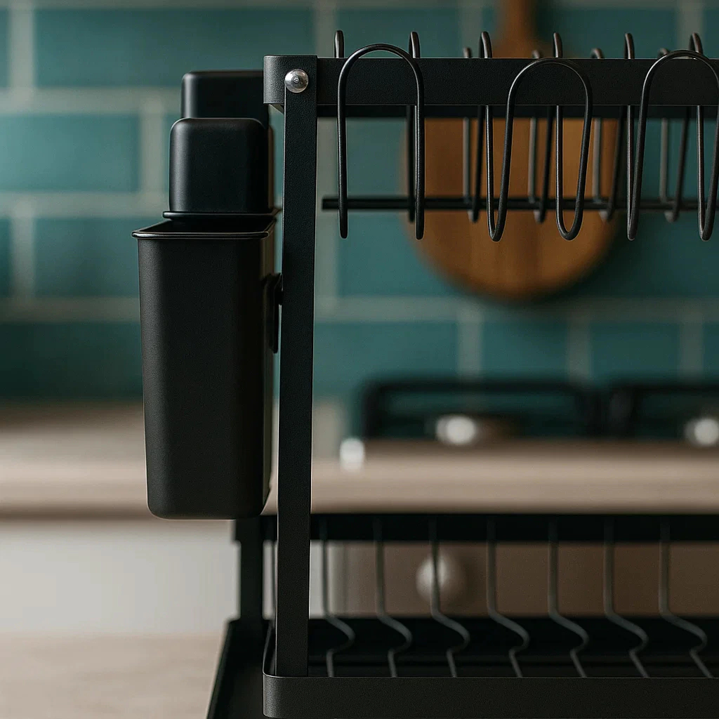 Escorredor de Louça 2 Andares com Suporte para Copos, Talheres e Tábua Se você busca um escorredor completo, moderno e durável, esta é a escolha certa. Com design elegante em preto fosco e estrutura reforçada, este escorredor de louça foi desenvolvido para trazer praticidade, organização e estilo para a sua cozinha. Alta capacidade e funcionalidade real O modelo de dois andares oferece espaço inteligente para acomodar uma grande quantidade de louças com segurança. • Comporta pratos grandes e pequenos • Suporte lateral com encaixe firme para até 6 copos ou taças • Porta-talheres removível para facilitar o uso e a limpeza • Suporte lateral exclusivo para tábuas de corte ou tampas • Bandeja inferior com sistema de drenagem que evita acúmulo de água • Design de drenagem ajustável e giratório de 360° Estrutura pensada para durar Fabricado em metal de alta qualidade com acabamento preto fosco, é resistente à ferrugem e traz um visual sofisticado que valoriza qualquer bancada, desde cozinhas compactas até espaços gourmet. Por que este escorredor vale a pena? - Design moderno e acabamento premium - Capacidade acima da média - Estrutura firme e bem dividida - Ideal para quem quer praticidade com estilo Perguntas Frequentes 1. O escorredor enferruja com o tempo? Não. A estrutura é feita de metal com acabamento fosco resistente à corrosão, ideal para ambientes úmidos. 2. A montagem é difícil? Não. Acompanha instruções simples e pode ser montado facilmente em poucos minutos, sem necessidade de ferramentas.