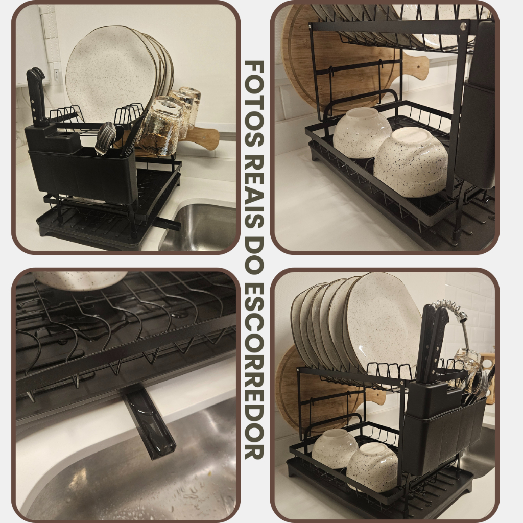 🚫 CHEGA DE PIA MOLHADA E DESORGANIZAÇÃO ✅ MANTENHA sua cozinha sempre organizada com o Escorredor Duplo em Aço Carbono com Sistema de Escoamento Próprio. 💧 O sistema de drenagem direciona a água diretamente para a pia, evitando acúmulo de água e mantendo a bancada sempre seca. 🍽️ Seu design de 2 andares aproveita melhor o espaço, acomodando pratos, copos, tigelas, talheres, facas e até tábuas de corte de forma prática e funcional. ---------------------------------------------------------------------------------------------⚠️⚠️⚠️ACOMPANHA MANUAL DE MONTAGEM⚠️⚠️⚠️-------------------------------------------------------------------------------------------------------------------- CARACTERÍSTICAS - Escorredor de 2 andares para maior capacidade - Sistema de escoamento próprio para a pia - Estrutura reforçada em aço carbono de alta durabilidade - Suporte lateral para talheres e facas - Compartimento exclusivo para tábua de corte - Acabamento moderno, ideal para qualquer cozinha - Capacidade para 10 pratos e 6 copos. ESPECIFICAÇÕES Material: Aço Carbono Dimensões (AxLxC): 42 x 30 x 34 cm Dimensões do porta talheres (AxLxC): 16x5x25,5cm Cor: Preto DICAS DE USO - Ideal para cozinhas que precisam de praticidade e organização - Use o escoamento sempre direcionado para a pia para evitar acúmulos - Recomendado para famílias que utilizam diversos tipos de utensílios diariamente PERGUNTAS FREQUENTES PERGUNTA: Ele cabe quantos pratos? RESPOSTA: O escorredor tem capacidade para 10 pratos e 6 copos. PERGUNTA: O escorredor suporta bastante peso? RESPOSTA: Sim, sua estrutura em aço carbono reforçado garante resistência para pratos, copos e tigelas sem deformar. PERGUNTA: O sistema de escoamento é fixo? RESPOSTA: Ele é ajustável para ser posicionado diretamente sobre a pia, facilitando a drenagem da água. PERGUNTA: A água do porta talheres e da tábua também vão para a base de escoamento? RESPOSTA: Sim, a base de escoamento é grande o suficiente para comportar todos os componentes do escorredor. ITENS INCLUSOS 1x Escorredor Duplo em Aço Carbono com sistema de escoamento próprio 1x Porta-talheres 1x Compartimento para Tábua de corte 1x Base de escoamento GARANTIA 3 meses com a loja para defeitos de fabricação.
