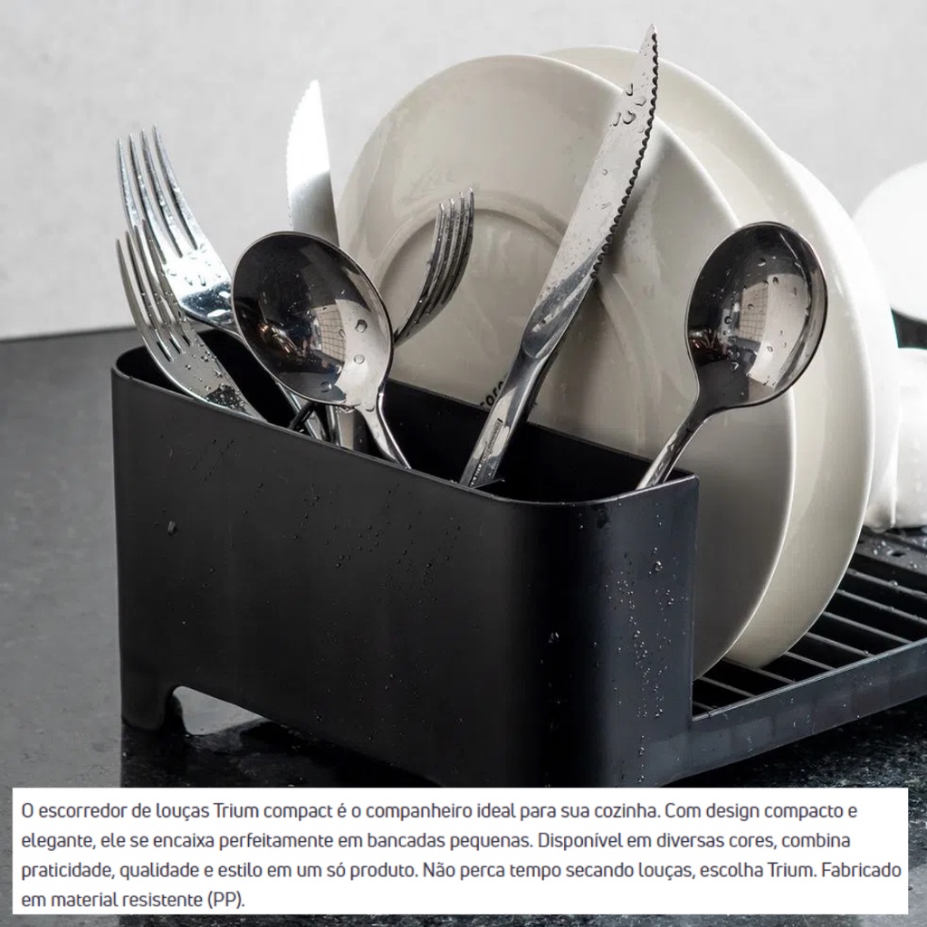 Detalhes do Produto O escorredor de louças Trium compact é o companheiro ideal para sua cozinha. Com design compacto e elegante, ele se encaixa perfeitamente em bancadas pequenas. Disponível em diversas cores, combina praticidade, qualidade e estilo em um só produto. Não perca tempo secando louças, escolha Trium. Fabricado em material resistente (PP).