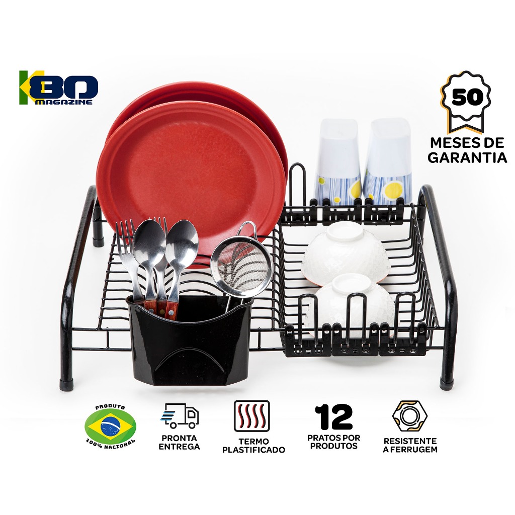 Produto ORIGINAL, fabricado no Brasil, com material resistente e durável Características: - Cor: preto - Dimensões: 46 x 15 x 38 cm - Capacidade para 12 pratos. - Capacidade para 6 copos (apoios individuais) - Com porta talheres removível - Material: Estrutura em Aço termoplastificado, pés com apoios em borracha, suporte para copos e porta talheres em resina plástica de alta resistência.