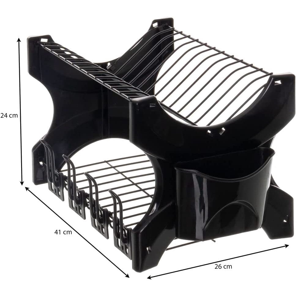 Escorredor de Louça Cozinha Prato Copo Talher Pia 2 Andares – Metaltru Descrição Breve: Escorredor de louça de dois andares, ideal para organizar pratos, copos, talheres e utensílios no dia a dia, oferecendo boa capacidade e estrutura compacta para a pia da cozinha. Características: Fabricado em metal com acabamento plastificado, é resistente, não enferruja e mantém a cor por mais tempo. Possui suporte lateral para até quatro copos, porta-talheres independente para facilitar o uso e dois níveis que ampliam a capacidade sem ocupar muito espaço. Comporta até 13 pratos, além de diversos utensílios, oferecendo praticidade na rotina doméstica. Dimensões: Altura: 24 cm Largura: 26 cm Comprimento: 41 cm Capacidade: Até 13 pratos e 4 copos no suporte lateral Cor: Preto Aplicações: Indicado para organização e secagem de louças, talheres, copos e utensílios em cozinhas residenciais, otimizando espaço e mantendo a pia sempre arrumada. Conteúdo da Embalagem: 1 escorredor de louça de 2 andares 1 porta-talheres Observação: Não acompanha outros itens que possam aparecer nas imagens.