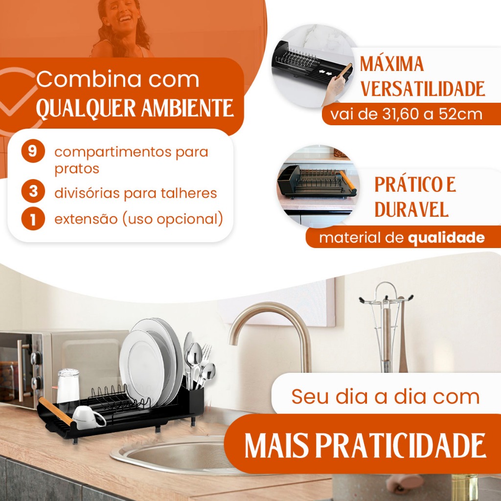 Escorredor de Louca Pratos Talheres Pia Cozinha Bandeja Retratil Slim Compacto Eco Design Preto