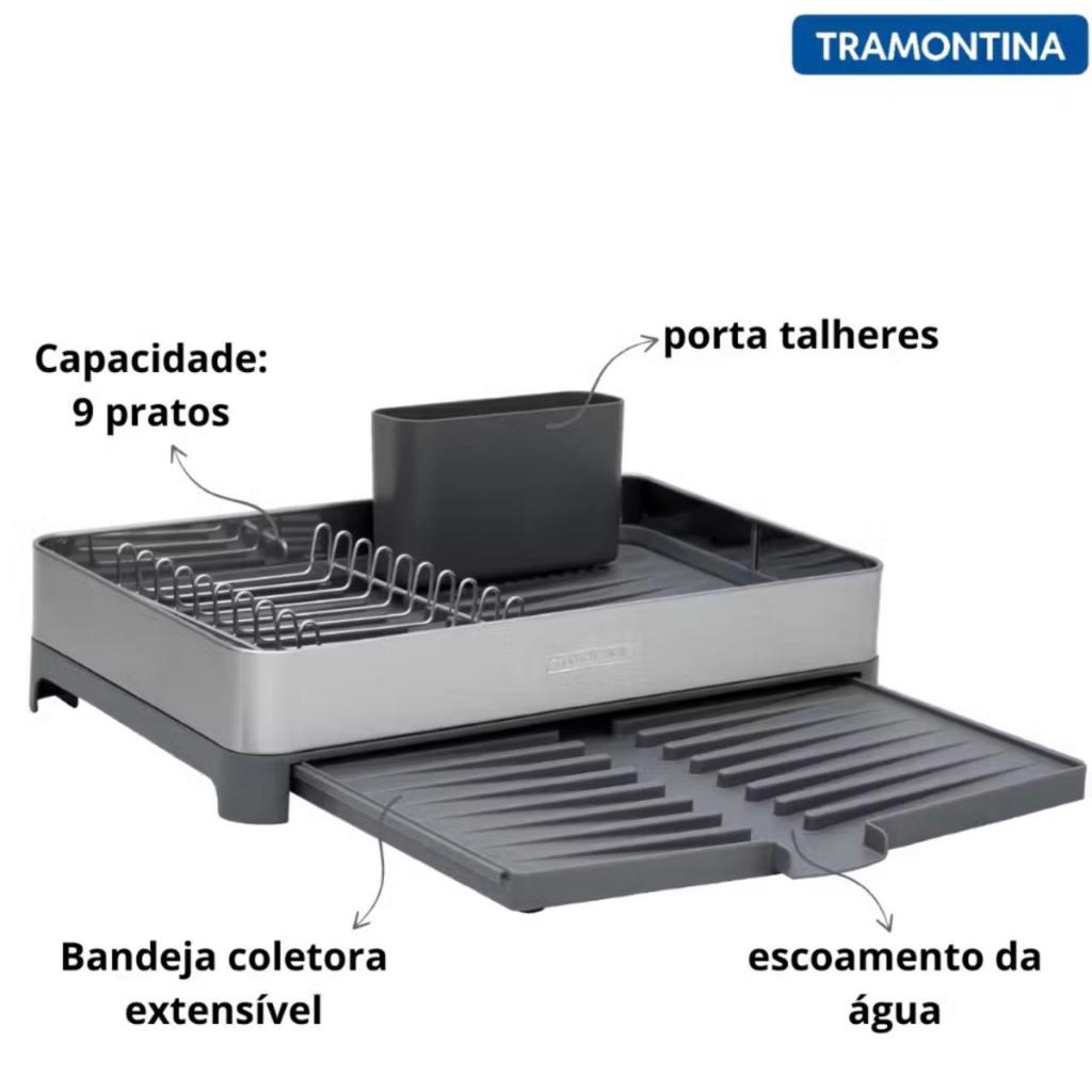 Para aqueles dias de rotina corrida que você não tem muito tempo para as tarefas de casa, conte com o escorredor de louça Tramontina Plurale em aço inox e polipropileno com porta talheres grafite. Ele conta com um prático porta talheres em polipropileno com perfeito encaixe em sua superfície. Compacto mais sem deixar de acomodar as louças que você precisa, ele comporta 9 pratos, talheres e copos, sendo o porta copos expansível. Possui alças que proporcionam maior segurança no manuseio e inclinação que direciona a água para a bandeja coletora, fazendo com que ela caia direto para a pia. Um item prático e indispensável para quem está sempre na correria! Porta-talheres de polipropileno, com encaixe no corpo do escorredor. Capacidade: é possível acomodar 9 pratos, copos e talheres. Porta copos expansível. Alças para maior segurança no manuseio. Dispõe de uma inclinação que direciona a água que escorre da louça na bandeja coletora, fazendo com que ela caia de modo direto na pia, deixando seu ambiente sempre seco e limpo. Medidas na terceira foto